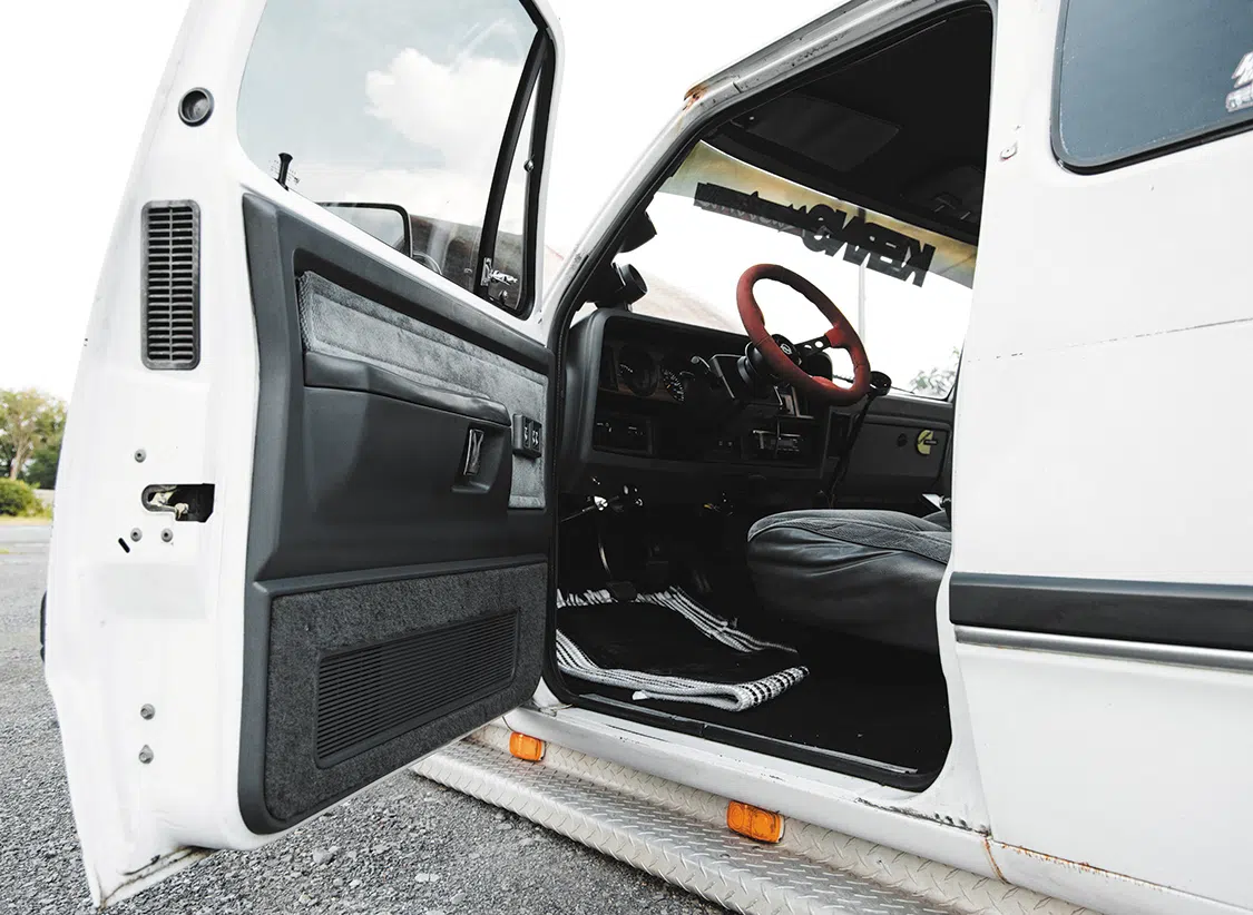 There are certain sayings that seem to perfectly describe certain scenarios. For instance, upon first laying eyes on Maverick Kerns’ laid-out ‘92 Dodge D350, one might exclaim, “You don’t see that every day,” and you’d be totally right. Unless, of course, you’re Maverick. But then, you might also say, “Holy smokes!” Again, you’d be right – it’s an old work truck, so it’s bound to have some holes here and there, and it’s running a modded 12-valve Cummins, so there’s going to be smoke.