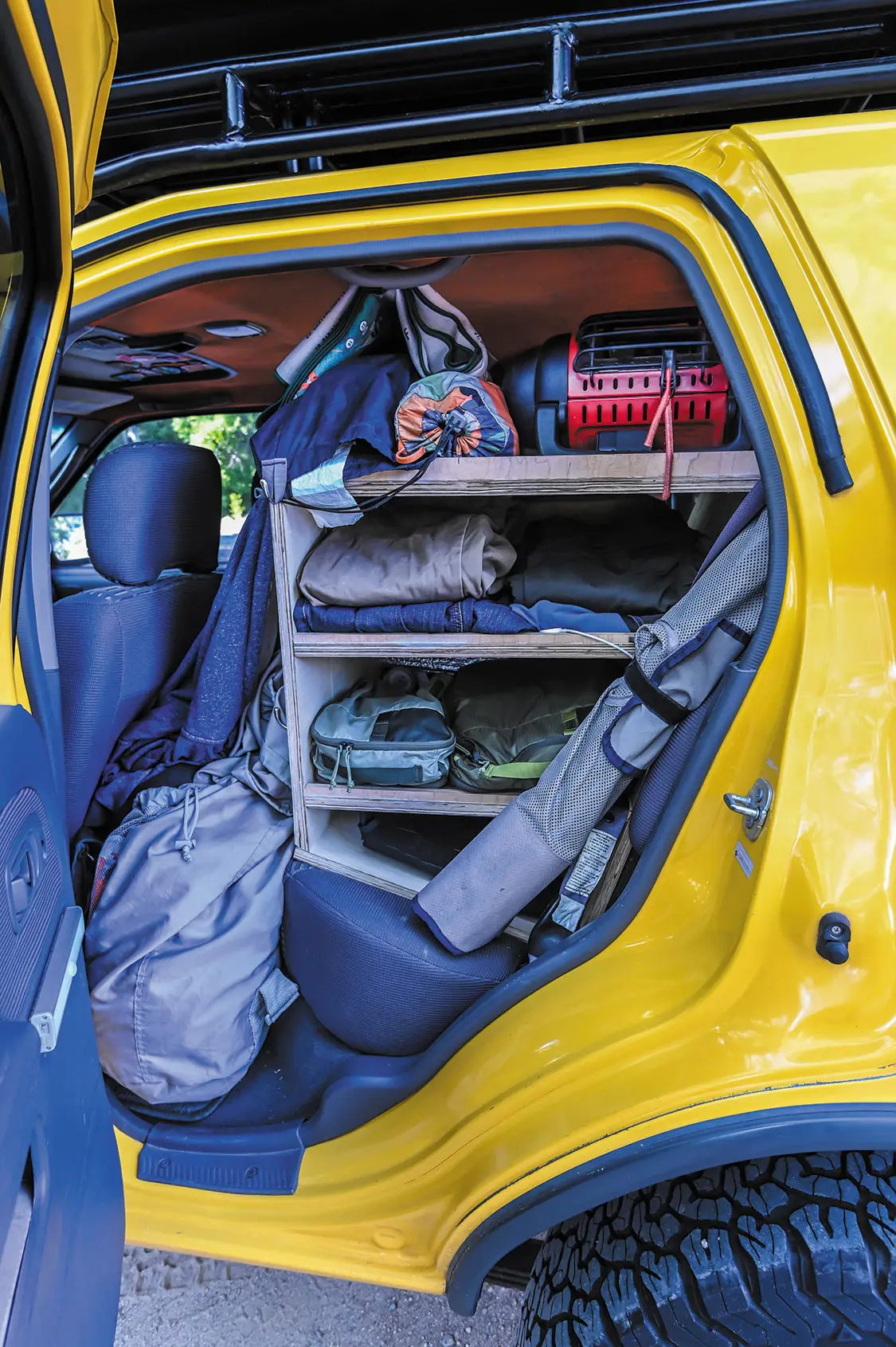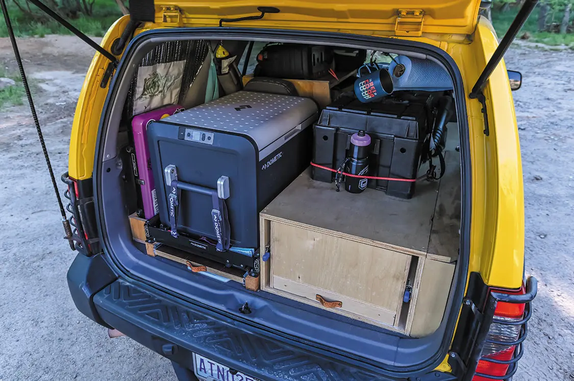 The back of the Xterra has been custom-built out with a wood drawer/wardrobe/kitchen/sleep platform system. The setup has a huge drawer for kitchen supplies, dry food, and White’s cigar humidor. Slide-out countertops create a kitchen area at the back of the vehicle that features a classic 1984 WhiteStag two-burner propane stove. The setup also has a slide with Dometic fridge/freezer and a hidden compartment on the side to store propane and spare fluids. A Front Runner Outfitters six-gallon water tank and Wolf Pack storage box complete the setup.