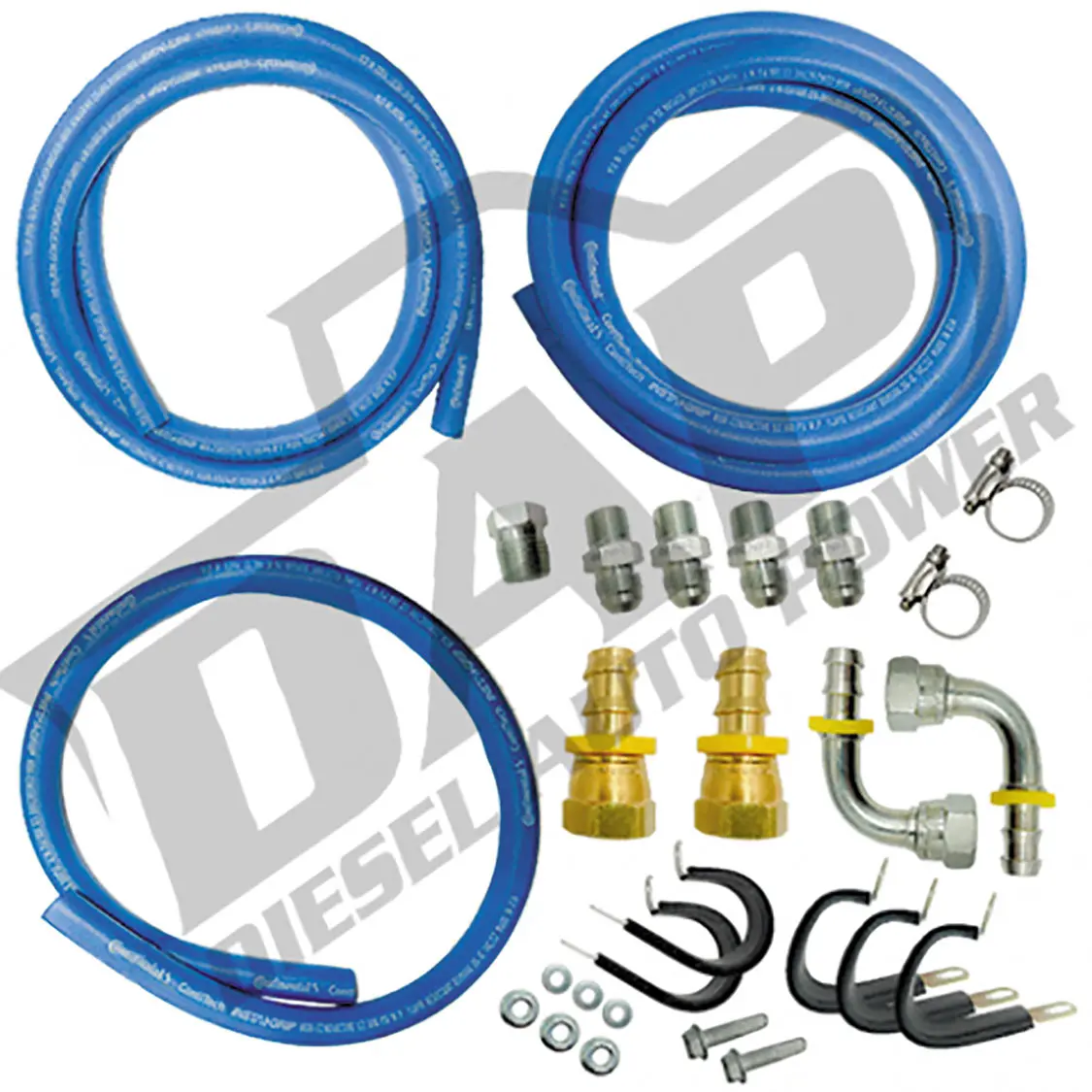 Diesel Auto Power’s 47RE transmission line kit fixes the common issue of leaking, broken, or pinched factory transmission cooler lines. This kit includes all the necessary fittings and hose to run new cooler lines from the transmission to the factory-location heat exchanger on the passenger side of the Cummins engine block, and then forward to the factory air to oil cooler in front of the radiator, and back to the rear cooler return fitting on the transmission. Also included are premium rubber coated line clamps that enable a clean and secure installation. The supplied blue hose is rated for high temperature and 300 psi pressure, the perfect hose for replacement transmission cooler lines.