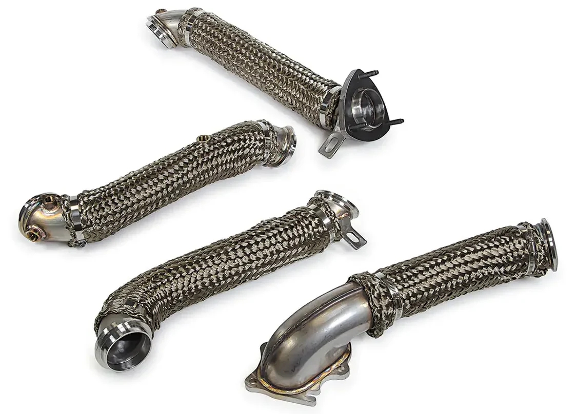 Remove your crushed oval-shaped stock downpipe and replace it with a smooth, round, long-lasting full 304 stainless steel downpipe from PPE. Includes a woven titanium sleeve to reduce engine bay temperatures.