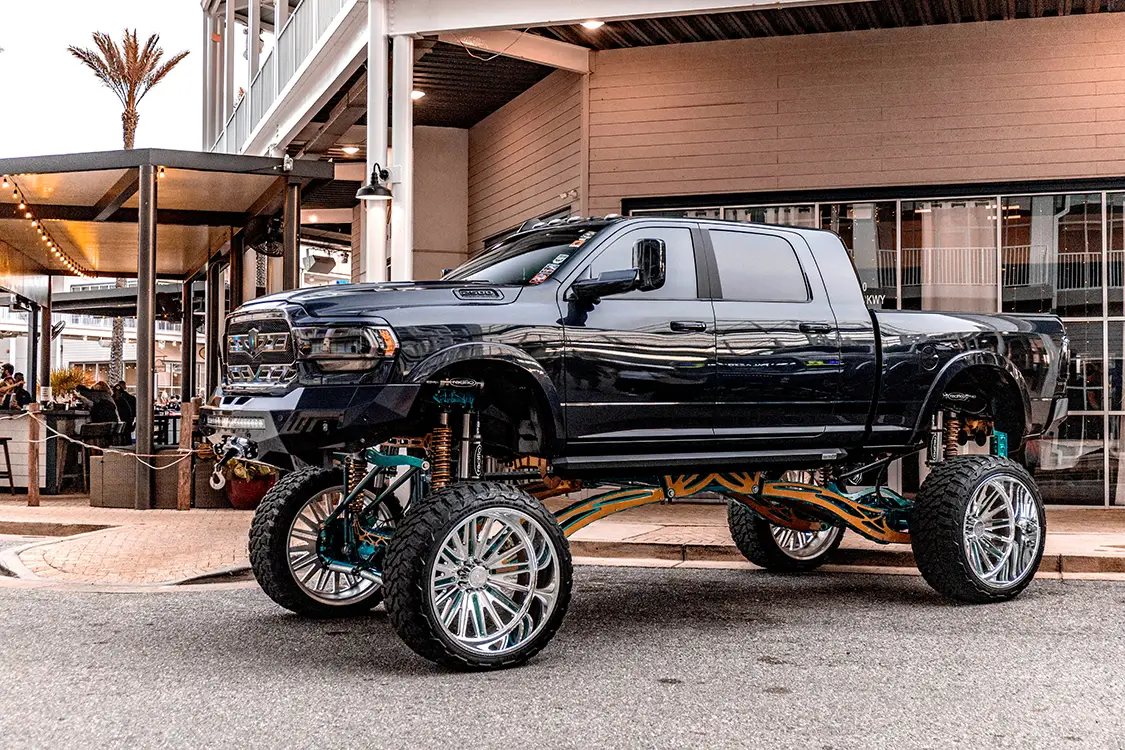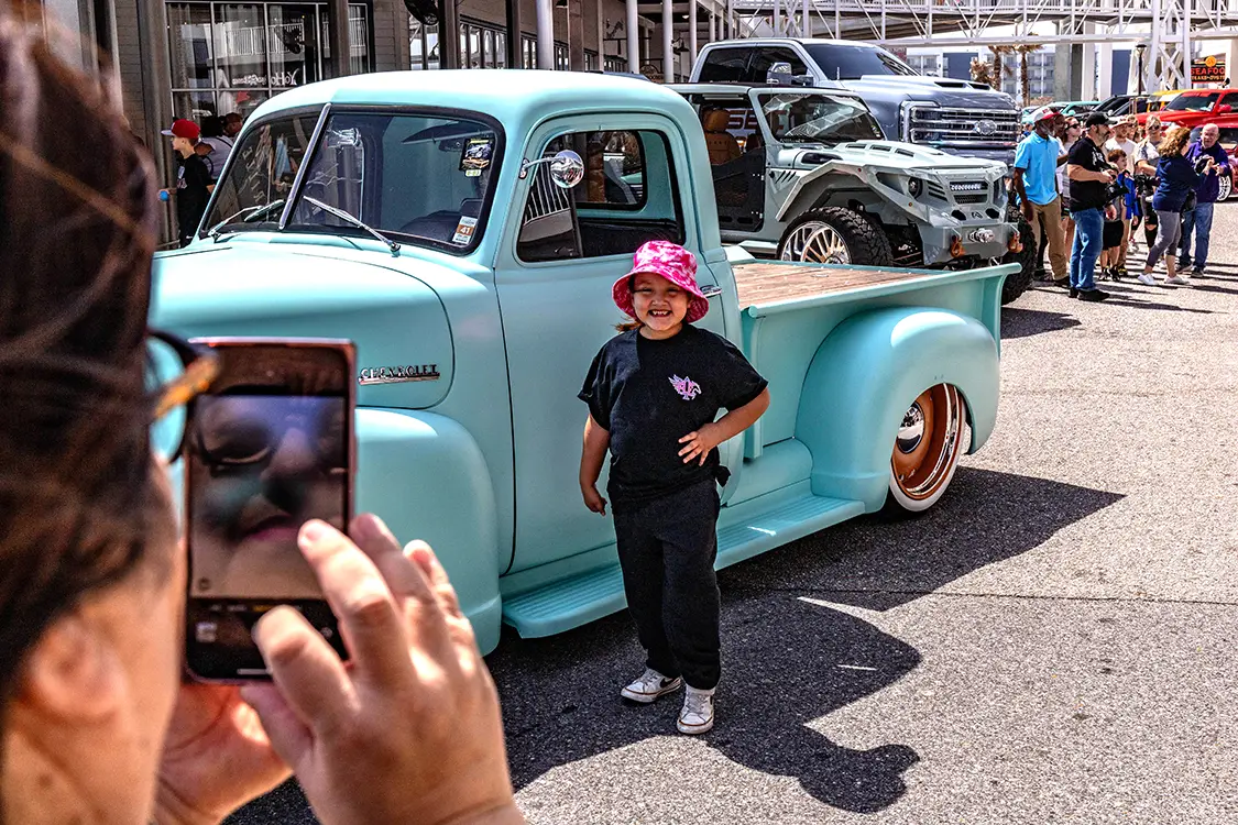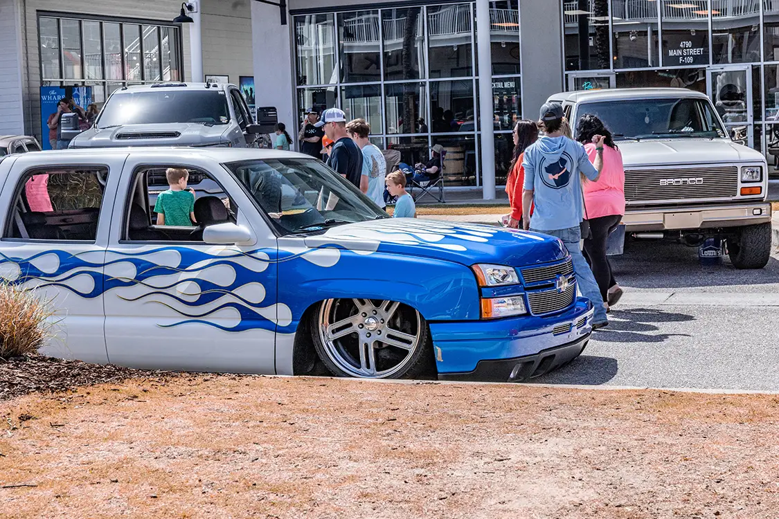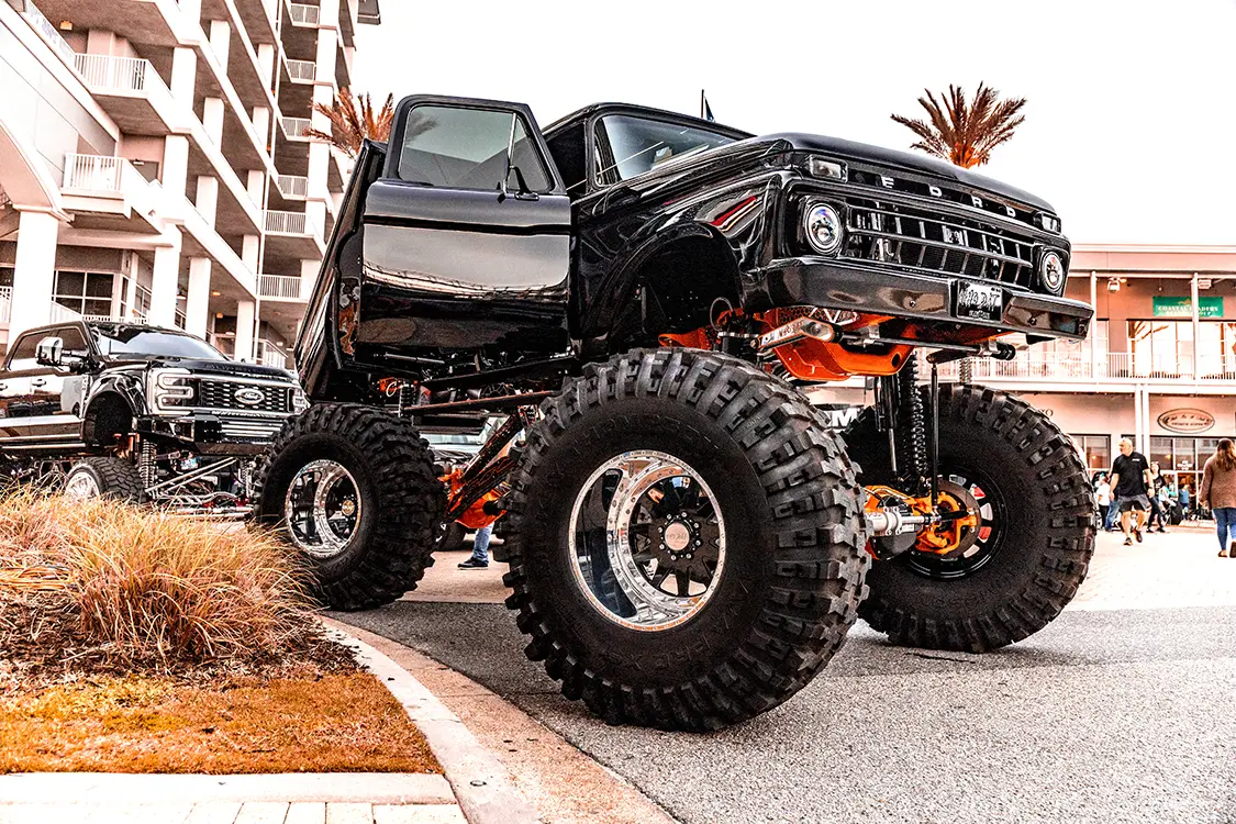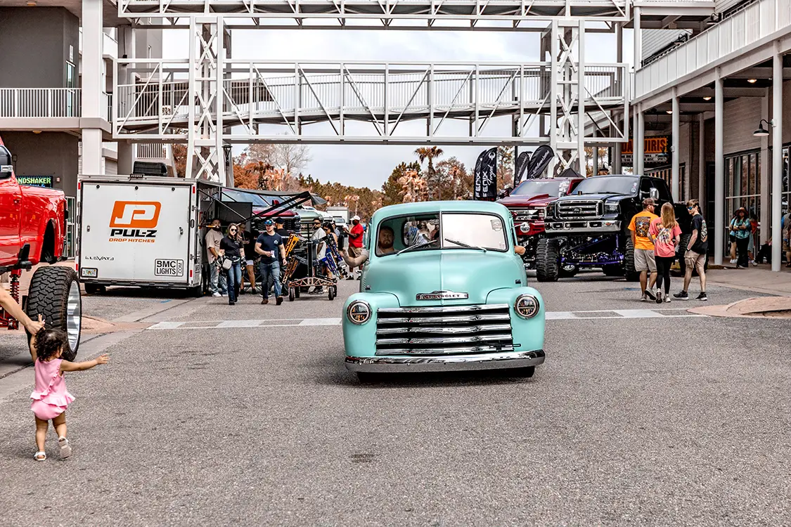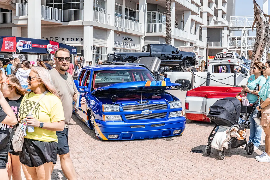 What truly sets Orange Beach Invasion apart is the vibe. During the day, the atmosphere is electric with trucks rolling in, cameras snapping, vendors slinging merch, and crowds soaking in the detail and design. But when the sun sinks below the horizon and the lights of The Wharf’s main plaza fire up? That’s when the show shifts gears. The nightlife at OBI turns into a rolling block party, where builds glow under neon and the entire venue pulses with energy. It’s like cruising into a scene from a dream where everyone shares the same passion for power and personality on four wheels.