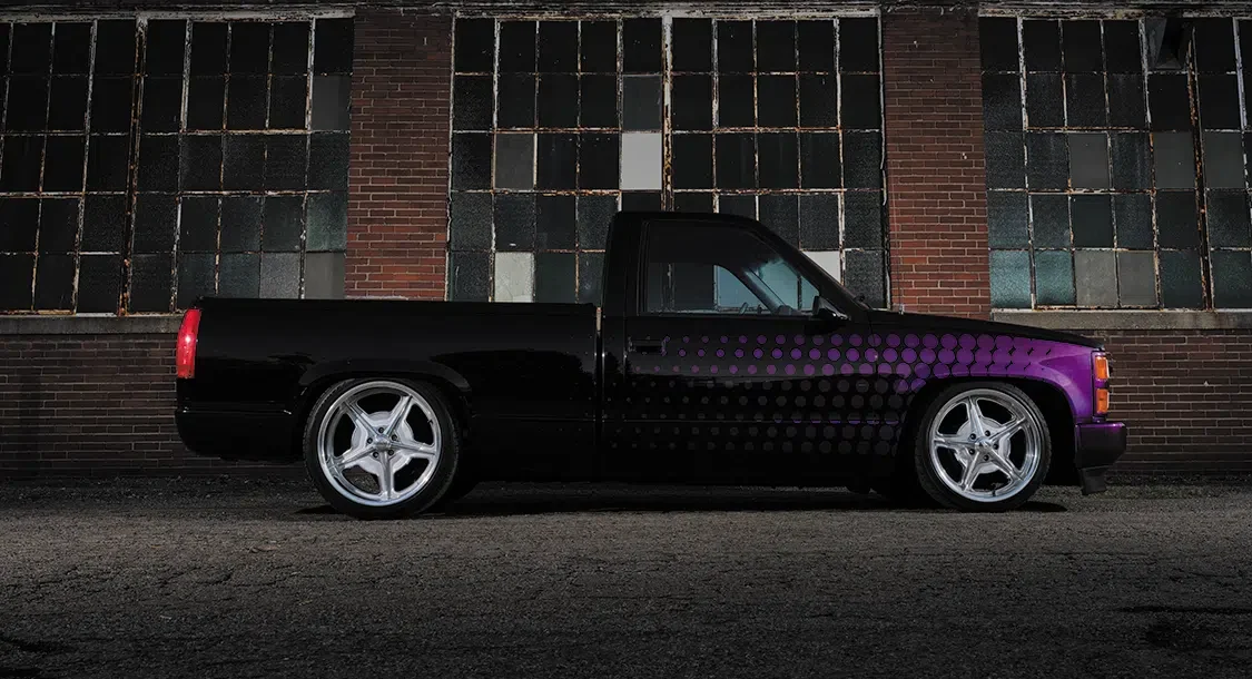 “I started by painting the entire lower portion of the truck with HOK Kandy Purple before painstakingly laying each row of the vinyl bubble pattern over the top,” he recalls. “I didn’t want the paintjob to be too loud, so I chose a HOK black color to spray over the purple. After removing the vinyl and covering the paint under multiple coats of clear, I was able to finally see that my idea had worked out pretty good.”