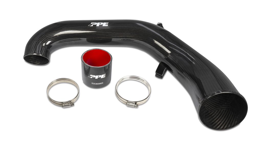Pacific Performance Engineering (PPE Power). N. Las Vegas, NV presents the PPE Zilla Carbon Fiber Intake Tube – an exceptional performance upgrade to your GM 3.0L Duramax. Handcrafted from 100% genuine, dry/prepreg carbon fiber and finished with a sleek clear coat, this intake tube exemplifies top-tier quality, performance and durability that is typically only seen on supercars. Through extensive testing and calibration, PPE has achieved a design that reduces pressure drop by 73% and optimizes airflow, resulting in improved engine performance and turbo efficiency. The kit Includes all the necessary hardware and easily mounts to the factory locations. The turbo side connection is secure with the provided silicone coupler and constant-tension clamps. Elevate your factory-restrictive plastic intake to a whole new level with the PPE Zilla Carbon Fiber Intake Tube, and experience the heightened throttle response, noticeable torque gain, and unmatched build quality.