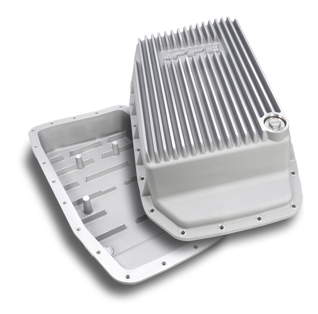 Pacific Performance Engineering (PPE Power). N. Las Vegas, NV the Heavy-Duty DEEP 6R80 Transmission Pan. It holds 4.25 extra quarts of fluid and is cast from A356.0-T6 aluminum alloy for optimum heat dissipation. The flat bottom design allows for complete fluid drainage. The pan has external fins and internal baffles to reduce fluid temperatures. The drain port includes a one-inch stainless steel drain plug with a powerful Neodymium magnet to catch harmful particles and protect the transmission internals. Run cooler and stronger with this easy upgrade to your six-speed transmission.