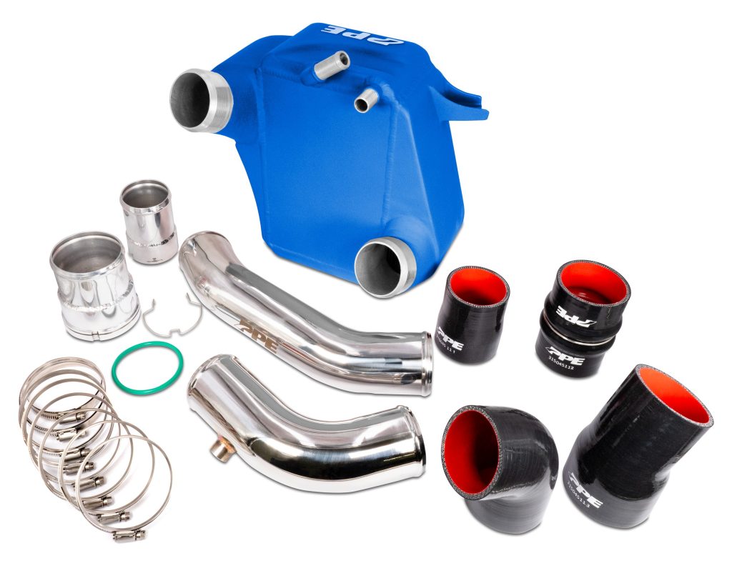 Pacific Performance Engineering (PPE Power). N. Las Vegas, NV presents The PPE high-performance water-to-air Intercooler adds both style and performance to your 6.7L Power Stroke. The PPE intercooler has increased cooling efficiency due to its all-aluminum Bar and Plate-style construction, superior fin layout, and 50% larger core. PPE has also redesigned the coolant’s distribution path to maximize the cooling capacity and efficiency. Cooler and denser charge air can also help reduce exhaust gas temperature (EGTs) and increase fuel efficiency. It also significantly improves the airflow and lowers the frictional pressure drop by 63%, thanks to its flow-optimized, cast aluminum end tanks. The kit is complete with everything needed for a seamless installation.