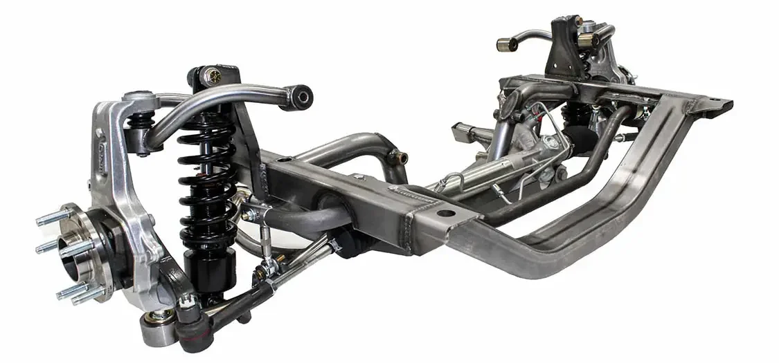 The precision fixture-welded assembly features tall forged aluminum steering knuckles with bolt-on unit bearings, high strength forged steering arms and TIG-welded tubular steel control arms. A custom-valved 17.5:1 ratio power steering rack provides improved responsiveness and a modern “feel.” AME-tuned coilover shocks plus an adjustable tubular anti sway bar complete the package.