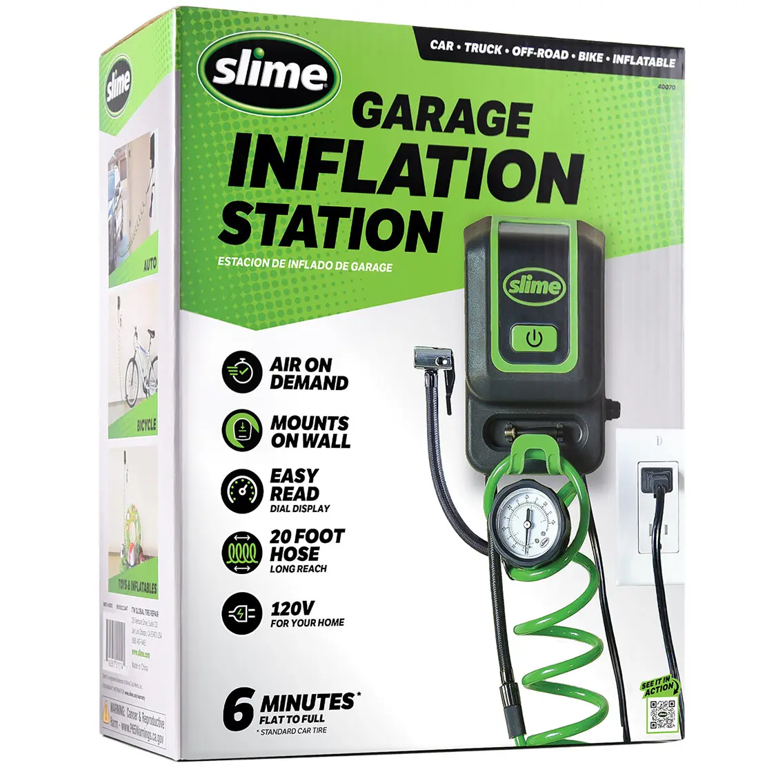 Slime, the nation’s leader in tire repair technology, is pleased to announce their new compact Garage Inflation Station, letting you air up everything in your home quickly and easily! With a 20-foot retractable hose, powerful and quiet motor for super-fast inflation, and easy-read digital display placed strategically where you need it, this Garage Inflation Station has you covered. Mount it to your garage wall and inflate away!