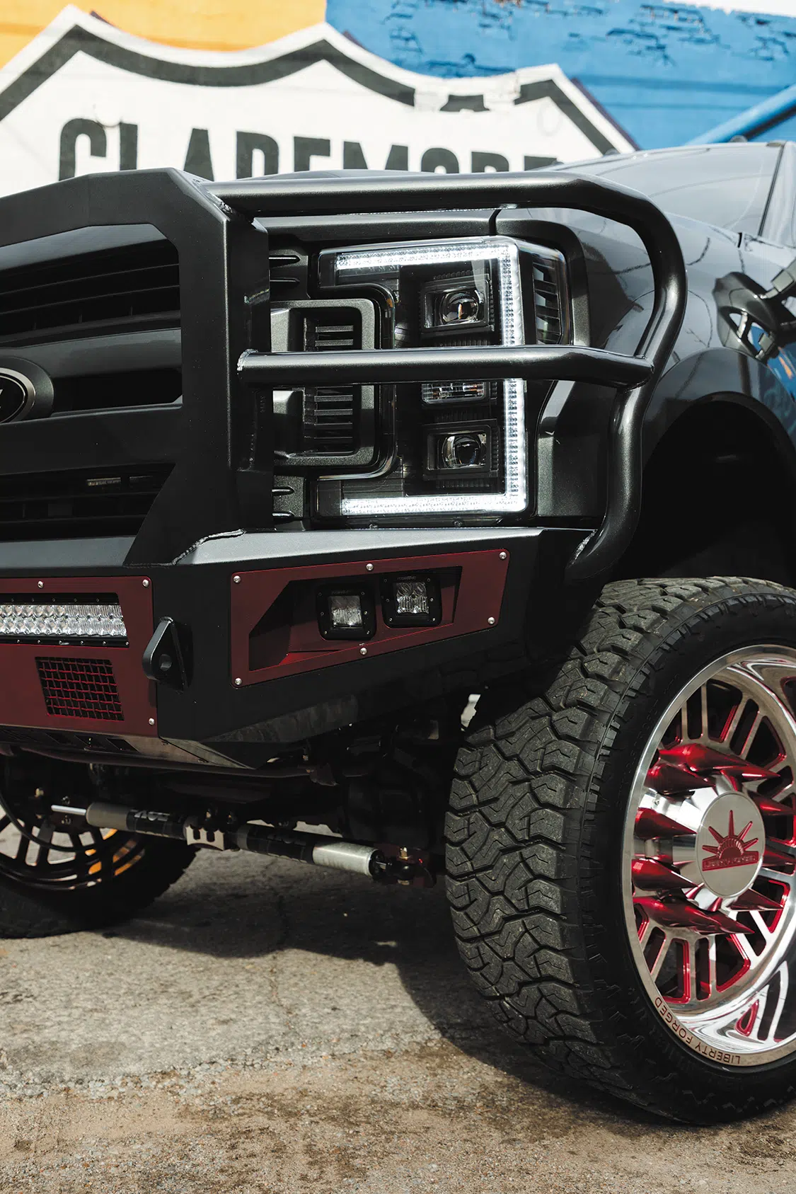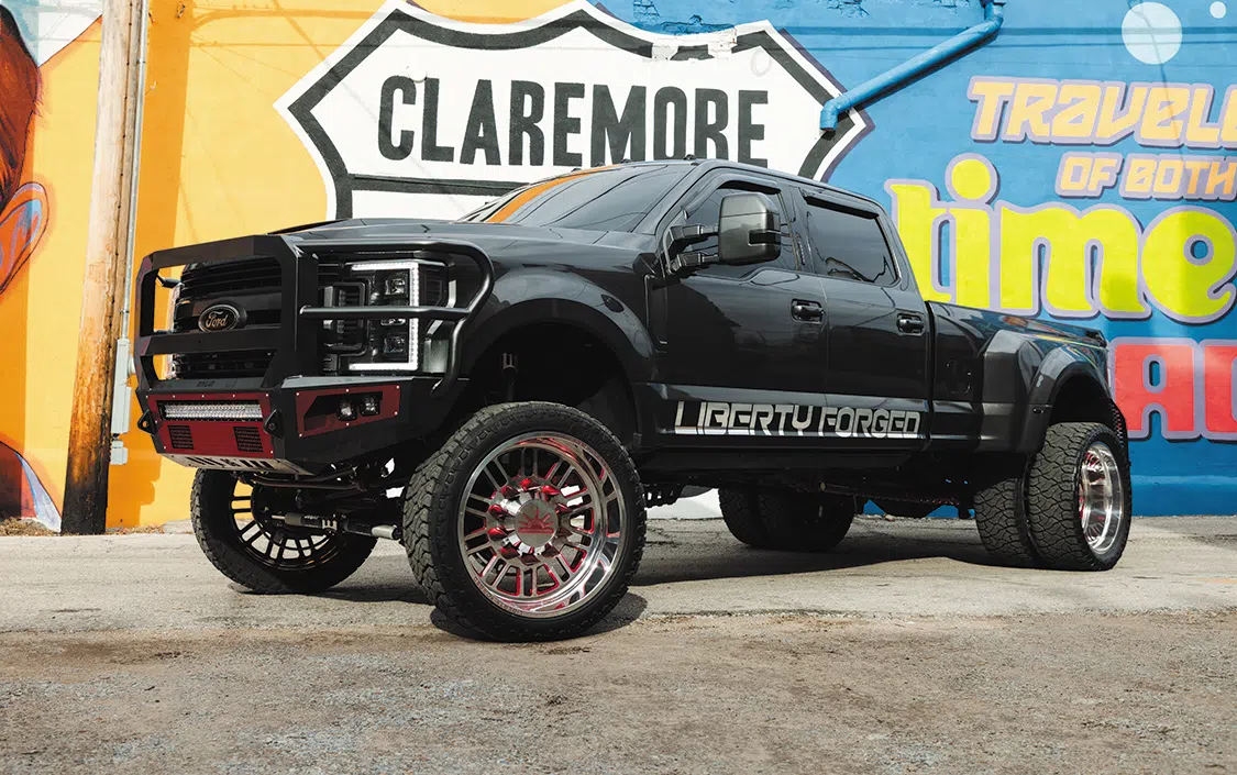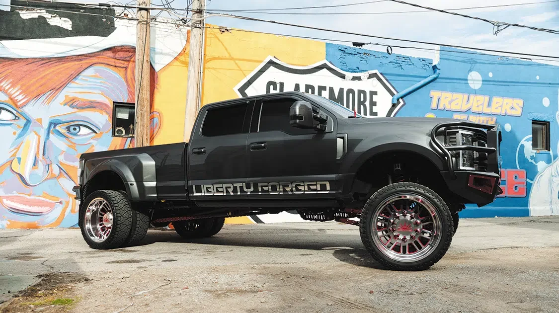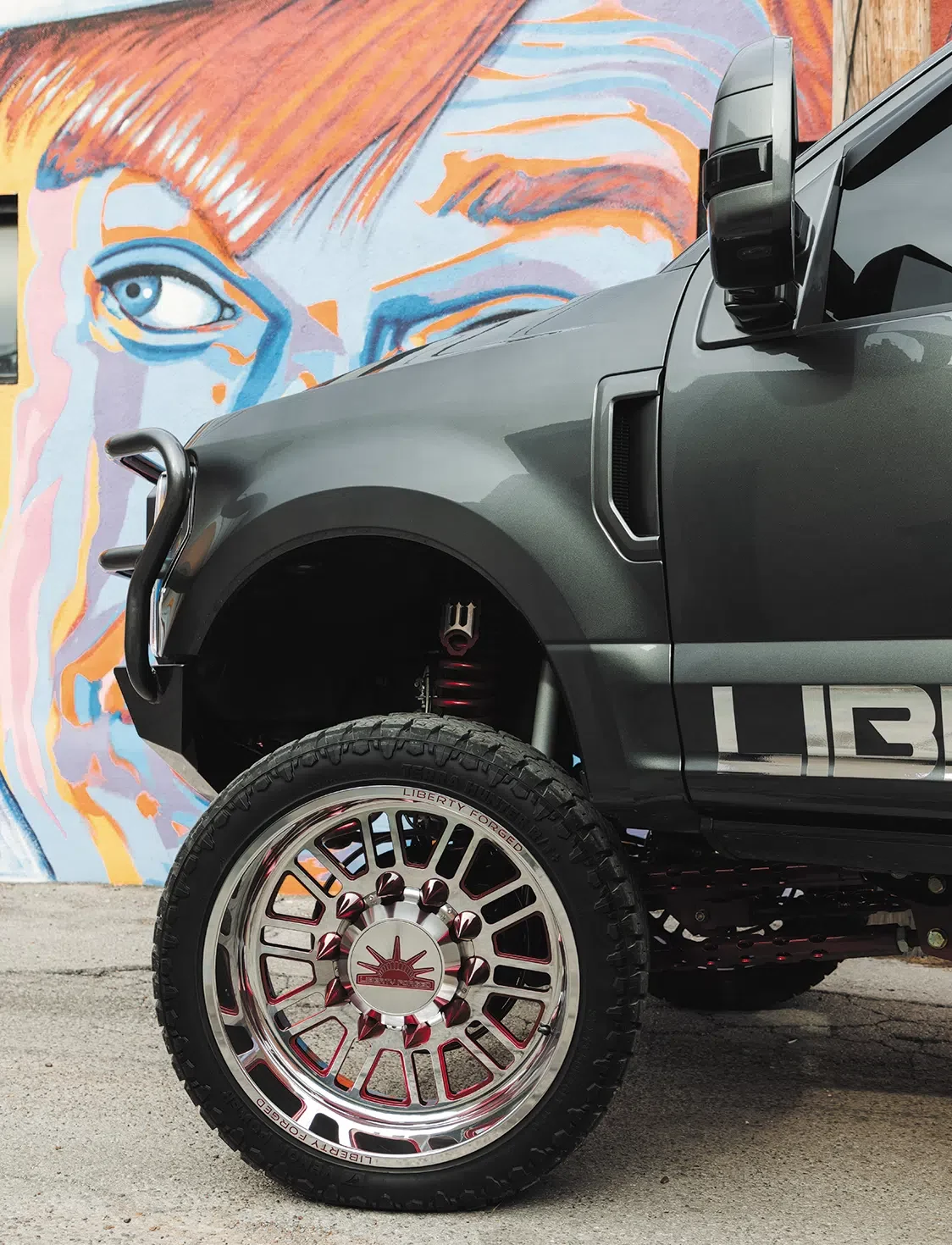Sometimes all you need in life is a really clean dually. Kenneth Statton, who goes by Kenny, out of Claremore, Oklahoma, has built just that. His gray 2018 Ford F-350 has gone through quite the transformation to become a show build that showcases Liberty Forged wheels, the brand his son, Steven Statton, started, while still maintaining the ability to tow and be a workhorse around town. Starting off, the truck of course had to get a set of 26×12 Liberty’s (LBTYD19’s) that came wrapped in a set of 37” RT Venom Power Tires, with the front wheels being super singles. Up next meant dropping the truck off at Highway 20 Collision in Claremore to get some Liberty Forged graphics made by Outlaw Graphics installed on the side of the truck as well as getting a few parts paint-matched. While there, the truck got a Bodyguard bumper swap for the front and rear that ensures the truck looks super sharp while being able to take any beating that comes its way. Rear view mirrors and the epic Cervini hood were painted to match as well. Underneath the truck you can find a six inch Wicked Customs Megalodon Elite Kit that has been powdered Illusion Ruby Red, and it cannot be said enough how perfectly the powder compliments the metallic grey. In addition to the lift being powdered, Kenny went above and beyond and had the axles, the brakes, and the drivelines entirely powdered Illusion Ruby to really bring the undercarriage together as one cohesive design. Behind the wheels you’ll note Rek Gen Mud Flaps to help curb any debris being flung from the massive tires. And if you’re having a difficult time seeing the underside? Fear not! 24 Beemer rock lights have been installed that send a cascade light on every nook and cranny, allowing the powder to shine and sparkle with ease. Even on the Mach1Media shoot with this truck in the empty lakebed at SEMA 2023, there was almost no issue capturing everything underneath, which is pretty surprising considering how epically bright it can be out there! As far as the interior goes, Code Zero Customs did their thing and painted all of the plastic pieces, and installed a subwoofer with a custom enclosure under the back seat.