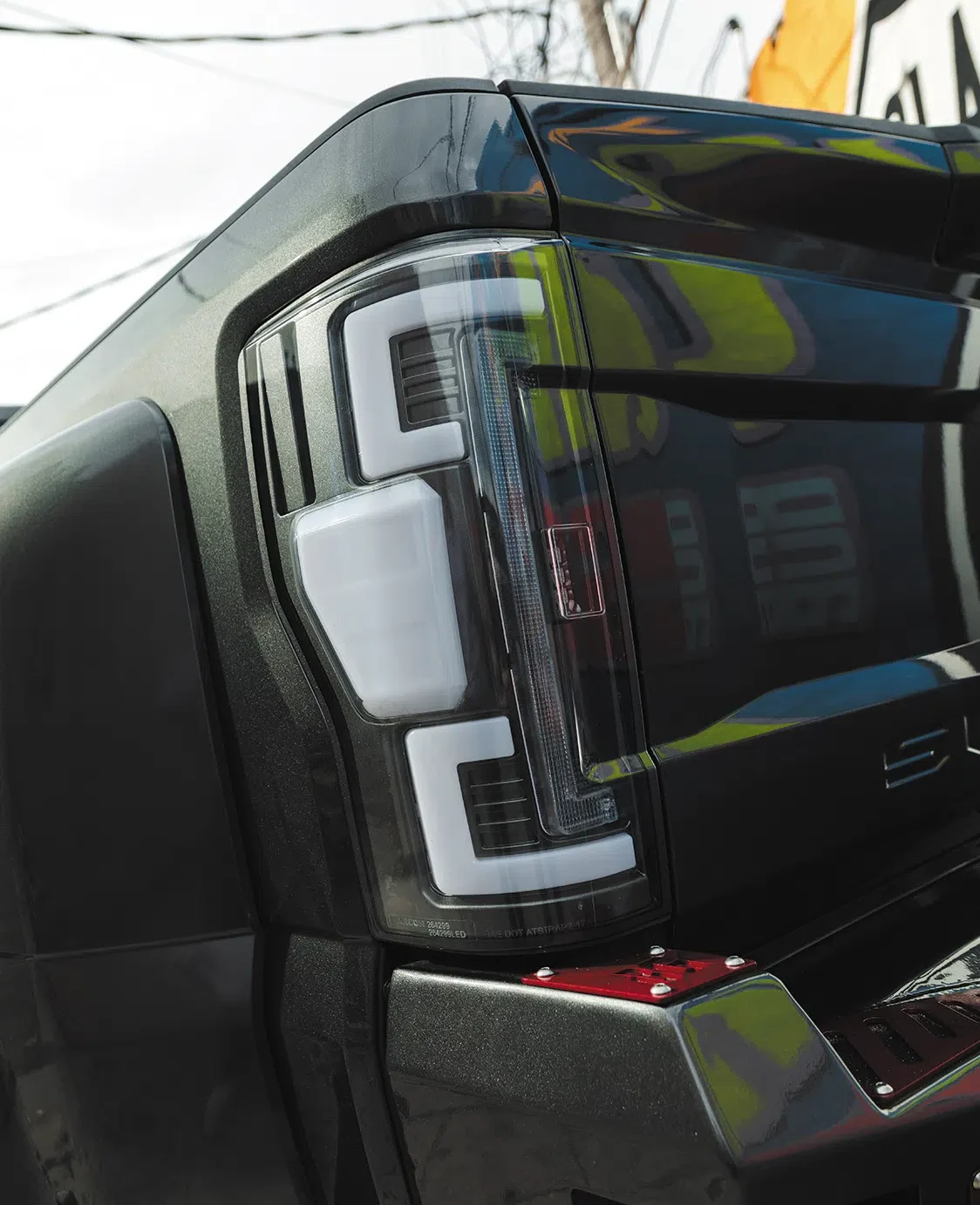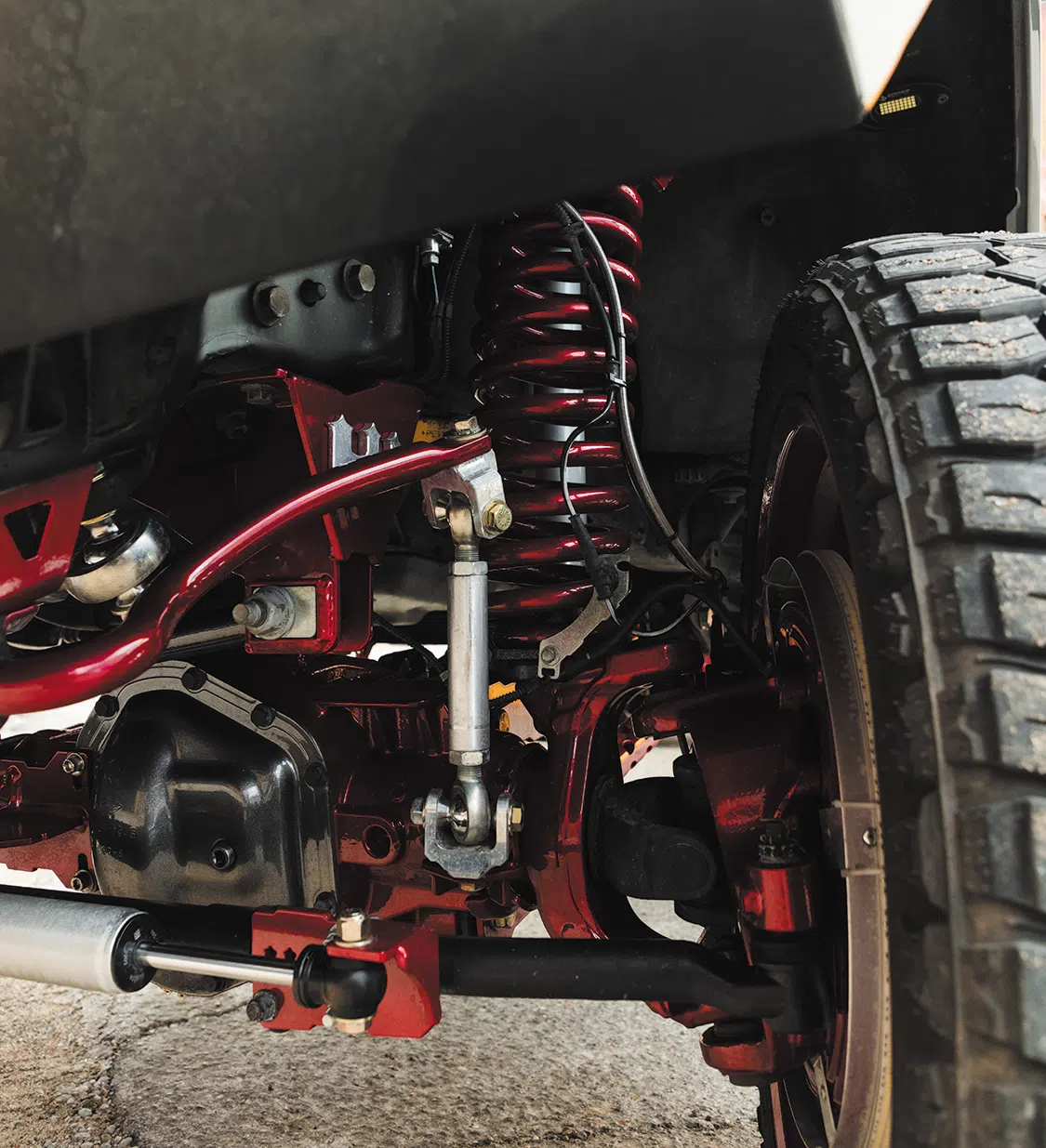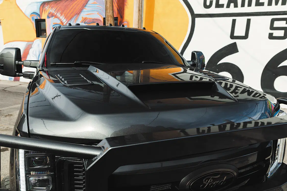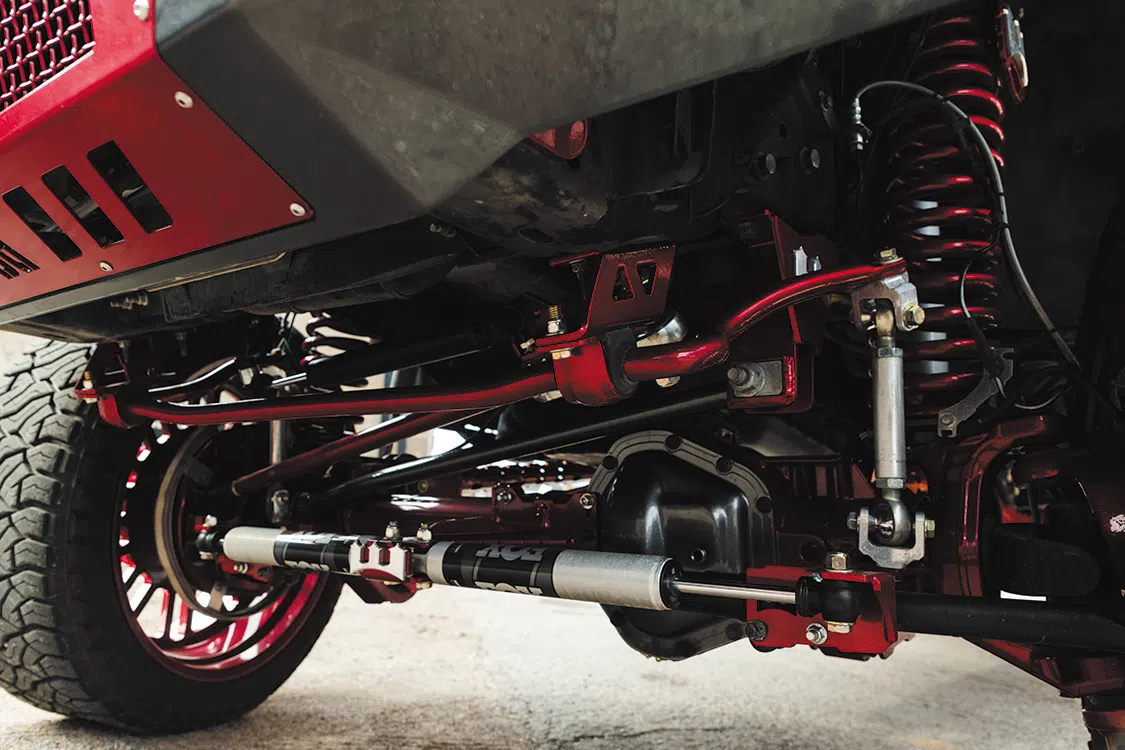 Sometimes all you need in life is a really clean dually. Kenneth Statton, who goes by Kenny, out of Claremore, Oklahoma, has built just that. His gray 2018 Ford F-350 has gone through quite the transformation to become a show build that showcases Liberty Forged wheels, the brand his son, Steven Statton, started, while still maintaining the ability to tow and be a workhorse around town. Starting off, the truck of course had to get a set of 26×12 Liberty’s (LBTYD19’s) that came wrapped in a set of 37” RT Venom Power Tires, with the front wheels being super singles. Up next meant dropping the truck off at Highway 20 Collision in Claremore to get some Liberty Forged graphics made by Outlaw Graphics installed on the side of the truck as well as getting a few parts paint-matched. While there, the truck got a Bodyguard bumper swap for the front and rear that ensures the truck looks super sharp while being able to take any beating that comes its way. Rear view mirrors and the epic Cervini hood were painted to match as well. Underneath the truck you can find a six inch Wicked Customs Megalodon Elite Kit that has been powdered Illusion Ruby Red, and it cannot be said enough how perfectly the powder compliments the metallic grey. In addition to the lift being powdered, Kenny went above and beyond and had the axles, the brakes, and the drivelines entirely powdered Illusion Ruby to really bring the undercarriage together as one cohesive design. Behind the wheels you’ll note Rek Gen Mud Flaps to help curb any debris being flung from the massive tires. And if you’re having a difficult time seeing the underside? Fear not! 24 Beemer rock lights have been installed that send a cascade light on every nook and cranny, allowing the powder to shine and sparkle with ease. Even on the Mach1Media shoot with this truck in the empty lakebed at SEMA 2023, there was almost no issue capturing everything underneath, which is pretty surprising considering how epically bright it can be out there! As far as the interior goes, Code Zero Customs did their thing and painted all of the plastic pieces, and installed a subwoofer with a custom enclosure under the back seat.