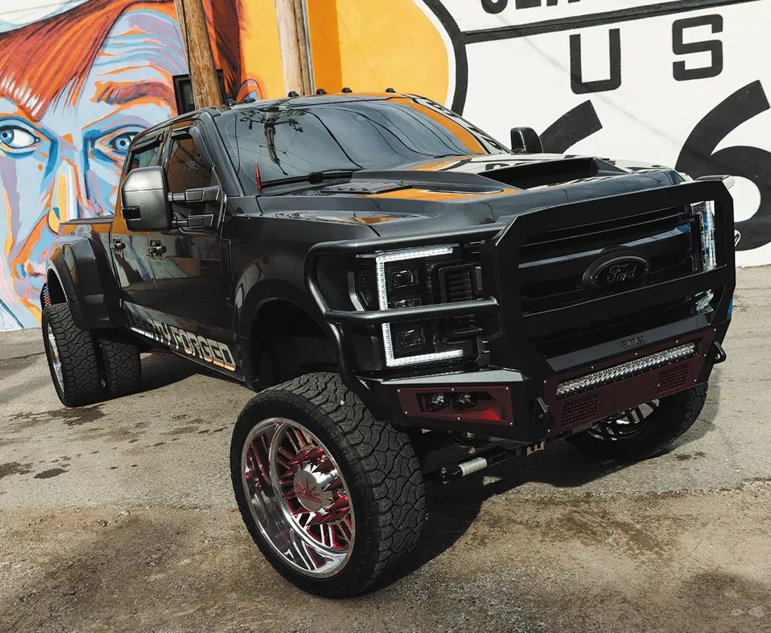 All in all, Kenny stated the easiest part of the whole build was dropping it off to get built! And even better, the whole build only took four months in total, despite being sent the wrong blocks for the rear part of the lift! For most of us, four months isn’t even enough time to settle on the powder color, what suspension, or what turbo size you want to run. For Kenny, time flew by. He’s been right back at driving it like a normal dually, ripping it around town and towing whatever he needs to. Apart from being able to enjoy the truck with his family and friends, he says his favorite part is the front bumper, as it really sets off the look and sets the tone of the whole build. Be sure to keep an eye out for the Liberty Forged convoy at a show near you!