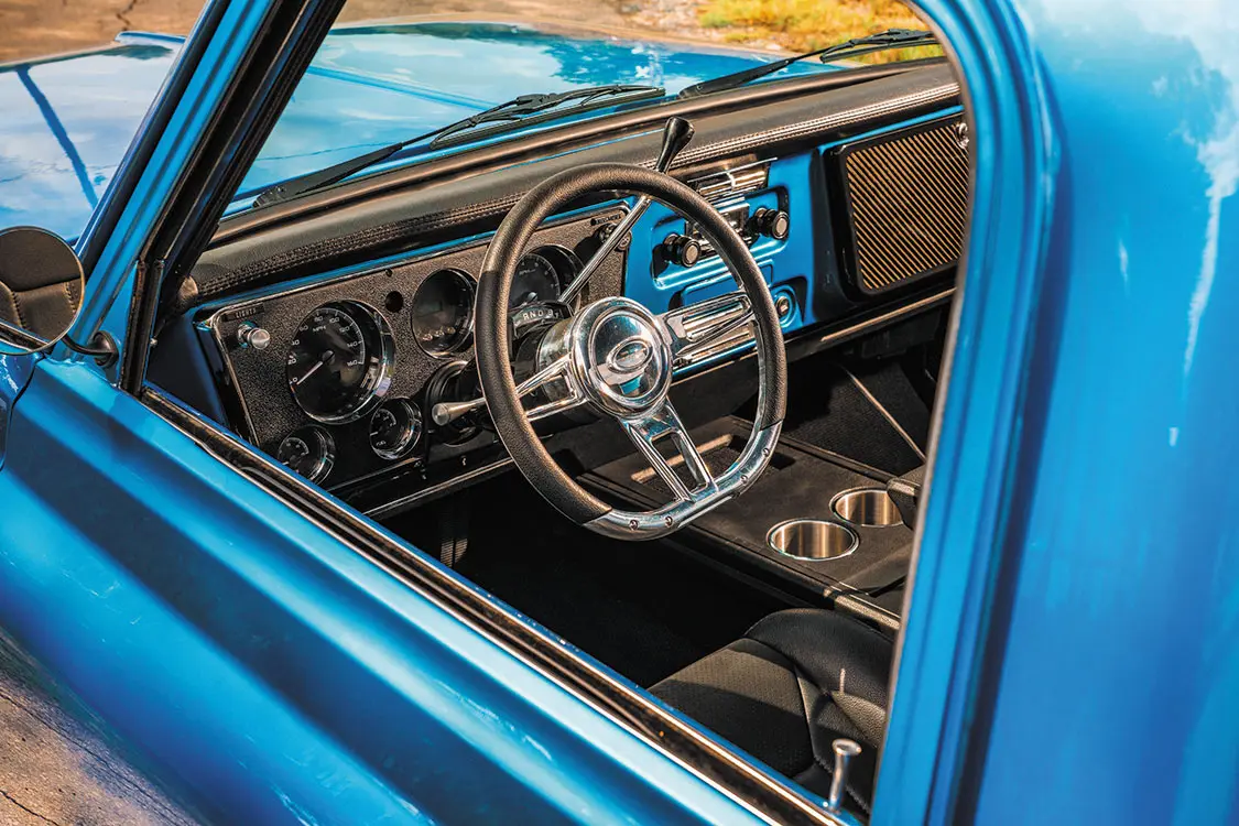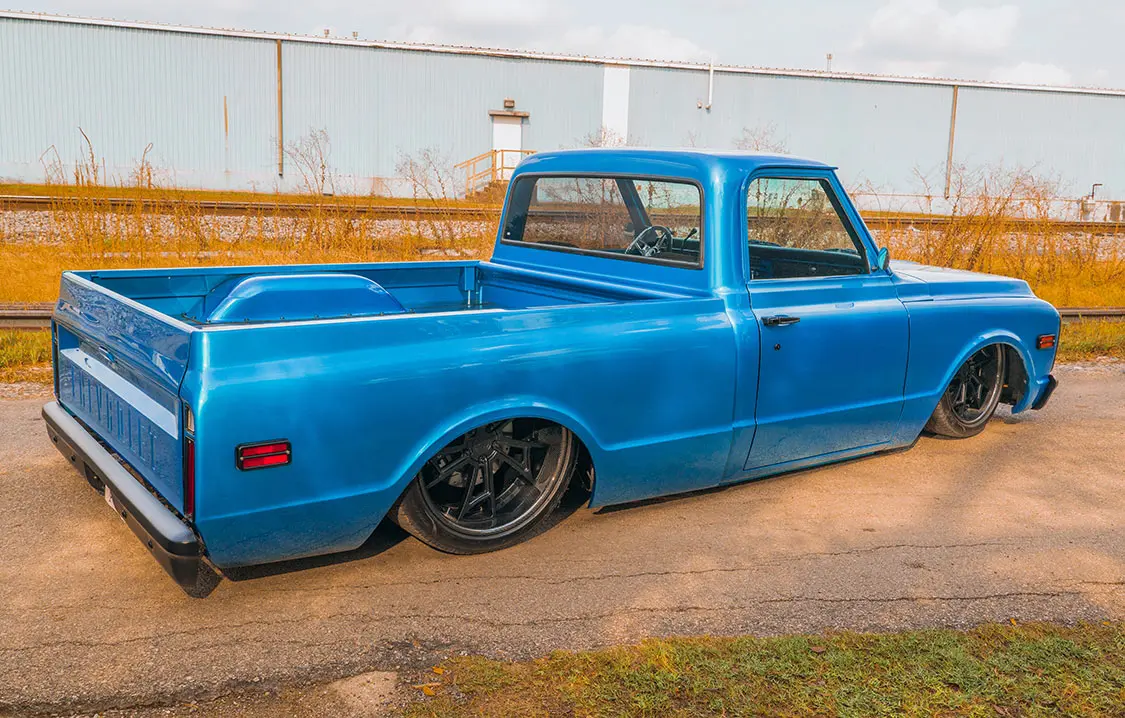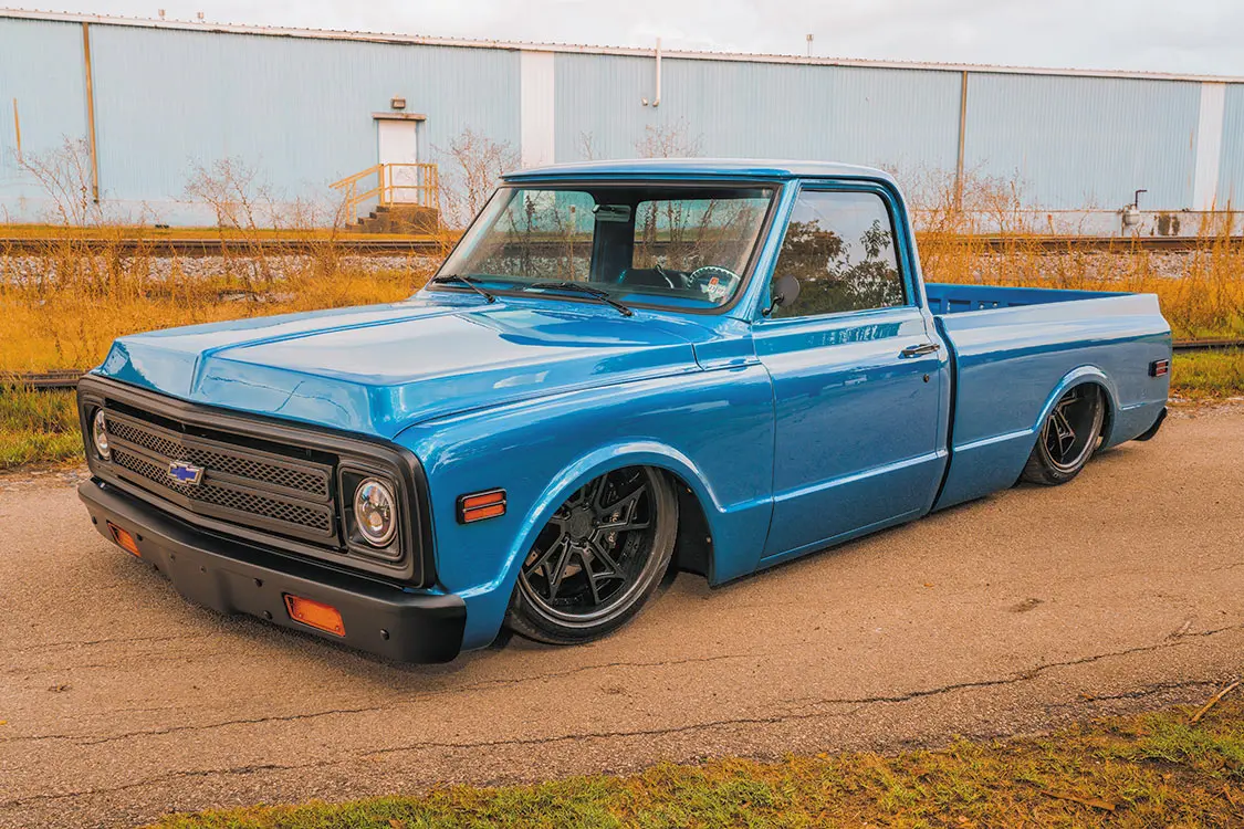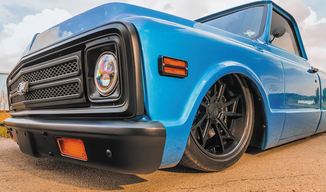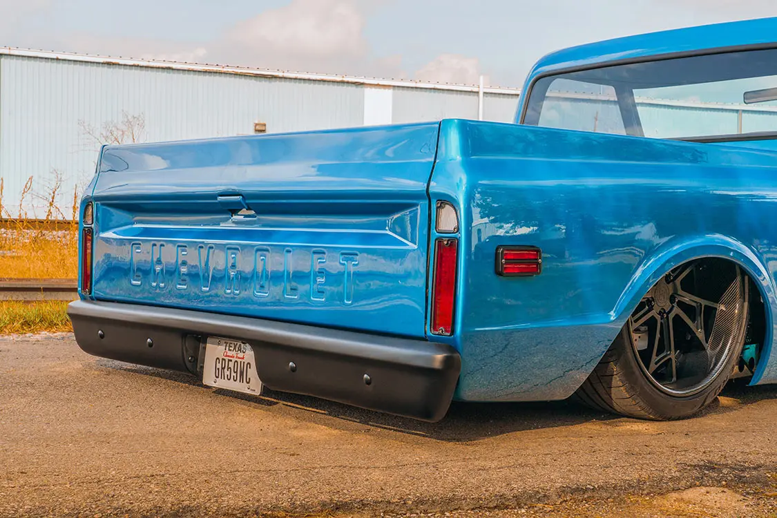 Next, the gas filler was shaved clean from the Chevy’s surface and was relocated back behind the rear side light marker for a much smoother appearance. After some more minor tweaks to the exterior, the truck was then sent over to Mo’s Image Customs in Miami for a fresh coat of Lemans Blue paint. The color selection was on-point with the performance-centered direction Nathen’s truck was headed.