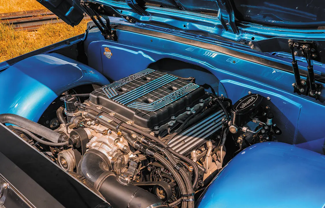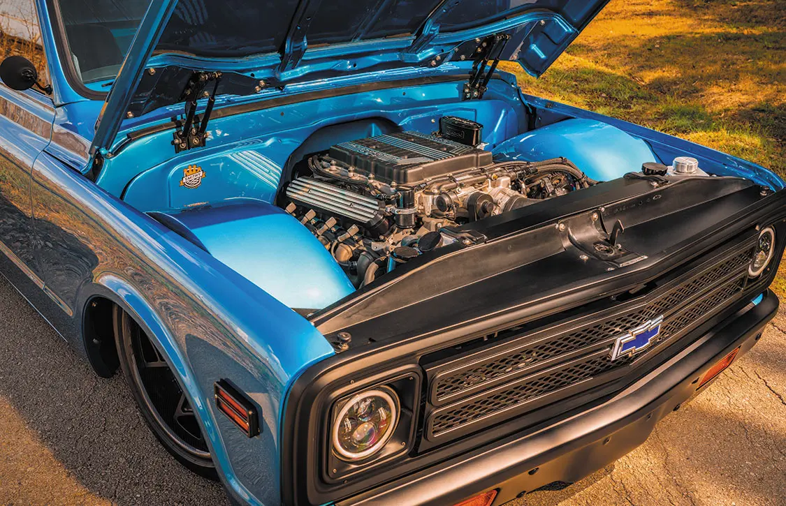 With the truck’s chassis well taken care of, Nathen then set his focus on swapping in an exciting engine that would really make a difference underneath the hood. What he ordered for his C10 was a supercharged LT4 Wet Sump 6.2L crate engine, which is the same power plant that equipped in the C7 Corvette Z06! This engine is the second most powerful engine ever offered in a regular-production Chevrolet vehicle with its 640HP and 630-lb-ft of torque straight out of the box. The 1.7L Eaton TVS supercharger creates more than 9-lbs of boost in the process of making that performance output. To maximize this power, a SuperMatic 10L90E 10-speed automatic transmission that can be found in Camaro SS ZL1 models, as well as late-model GM full-size trucks and SUVs was utilized for its advanced balance of performance and efficiency. Smithy Customs took on the installation of the drivetrain system, which also included adding a Speartech fuel injection, Drive Junky serpentine drive system, Griffin radiator and a MagnaFlow exhaust setup into the equation.