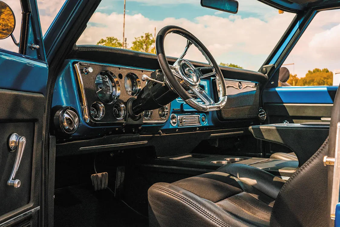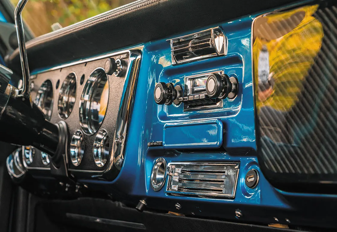 The inner cab of Nathen’s ’71 was also slated to receive a heavy dose of matching Lemans Blue paint, along with a full rehab treatment. Sublime Heights in Houston, TX joined the project at this point to create and upholster a pair of one-off door panels, bucket seats and a center console to divide them. A custom carbon fiber glove box was designed to tie in with the AG Luxury wheels, and a Billet Specialties steering wheel, Dakota Digital VHX Series gauges, a JL Audio stereo and a Vintage Air climate control system were added to the list of impressive in-cab inclusions.