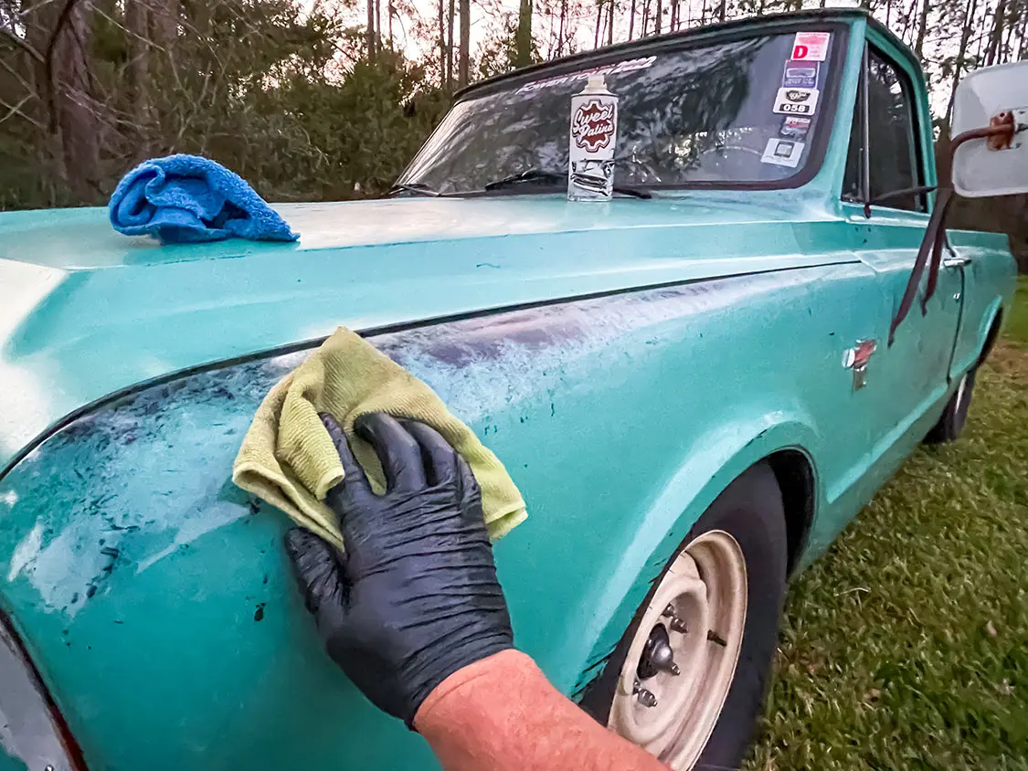 05. Once the entire truck was polished, it was time to do a final wipe-down to get rid of any residue left by the Century Polish. Applying the “Sauce” is as simple as wipe-on, wipe-off. Using a microfiber towel, I applied the “Sauce” using a circular motion similar to applying wax. Once I let the product sit for 15-20 minutes, I simply wiped it off with a new microfiber towel—and that’s it!