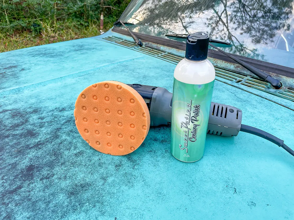 03. Now that the paint is clean and dry, I can move on to polishing. This step is not necessary, but it will add gloss and depth to the paint that is left on the truck since this polish is designed to be used on the worn, weathered, and oxidized paint that hasn’t reached the surface-rust stage. Take a look at the first section I polished (far right). The Century Polish removed all of the chalk and brought back some color and depth to this 56-year-old paint. I used an orange light cutting pad, making sure to clean it out regularly because the single-stage paint will clog your foam pad.