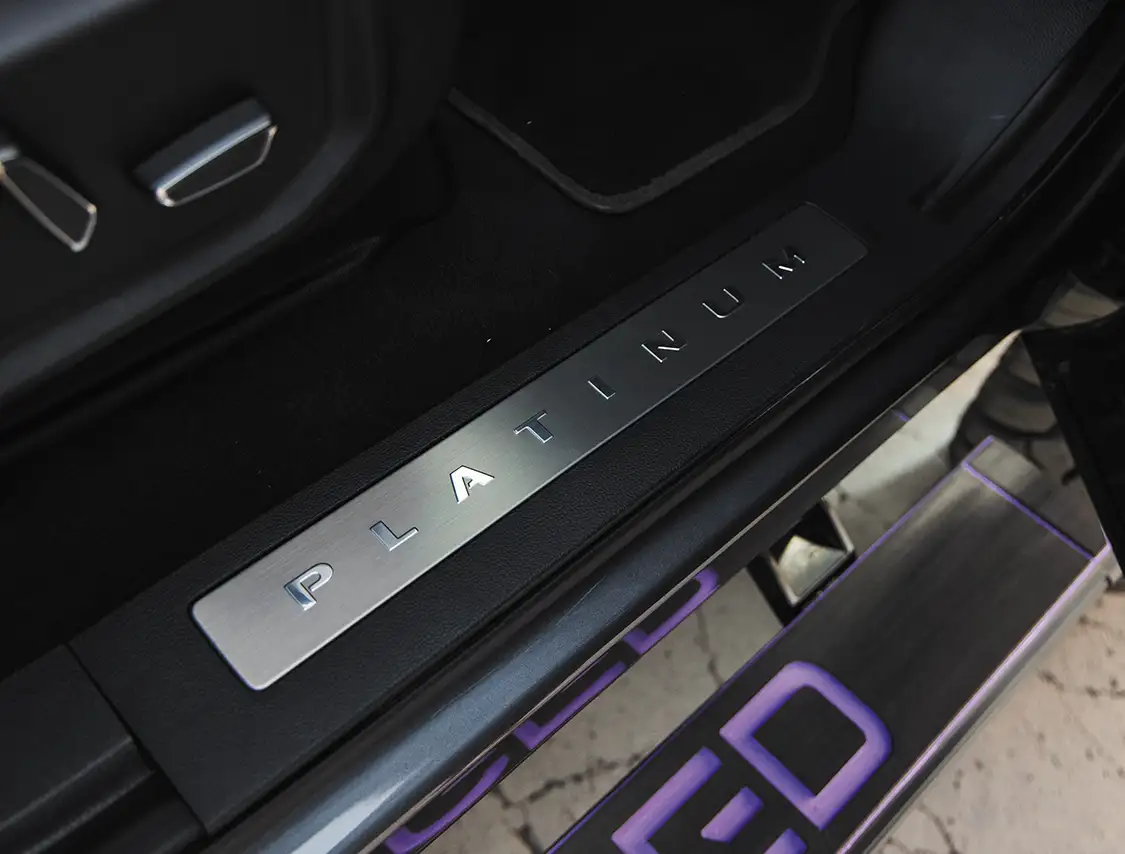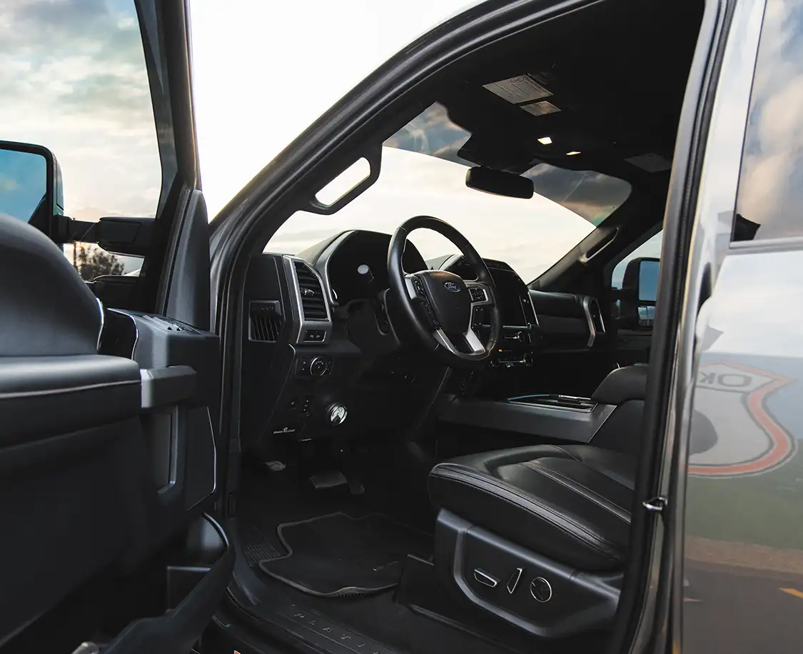 The fresh lift kit and rolling gear was enough to dramatically improve the looks and demeanor of the F-450, but Steve still had much more in store to alter its appearance. Heavy-duty, American-made Bodyguard Bumpers were selected to replace the factory units. The difference these things make is incredible. They’re just so visually striking—and built to last. Fitment is spot on with these things, and the utility of the front bumper with its mounting location for a light bar and grille guard option is extremely beneficial.  A Cervini’s cowl hood was next to find its way onto the F-450’s exterior landscape, as were Rek Gen mud flaps, and paint-matched accessories such as the headlights, taillights, and more. Increasing nighttime visibility and show-worthiness is a network of over 40 Beemer rock lights strategically positioned underneath the truck to properly highlight its impressive suspension setup. There’s absolutely no way of missing this truck whether it’s bombing down the highway or parked on full display at an event.