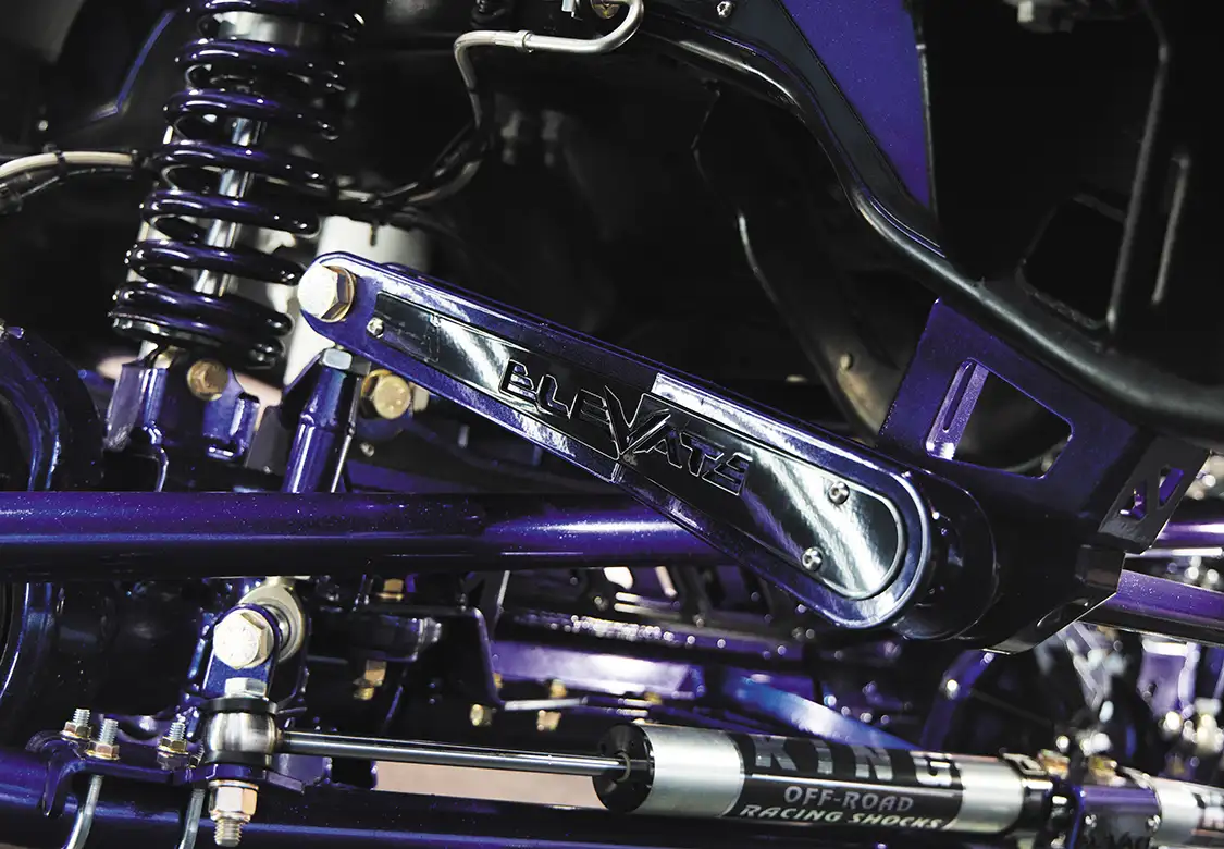 One of the major aspects of the build was to increase the F-450’s ride height. To do this, Steve reached out to Big Shot Industries in Du Quoin, Illinois to not only handle the installation of the new chassis components, but to also powdercoat them all as well. The lift kit in question came from Elevate Suspension, and the finished color Steve had in mind for the parts was radical. A Thunderkiss base and a Dirty Magic topcoat from Prismatic Powders was expertly applied to the Elevate components, as well as the King coilovers and shocks. Powdercoating these pieces not only added a layer of protection to them but increased the impact they make with them being so much more visible due to the Ford’s increased altitude.