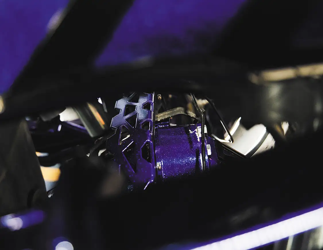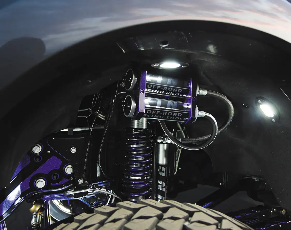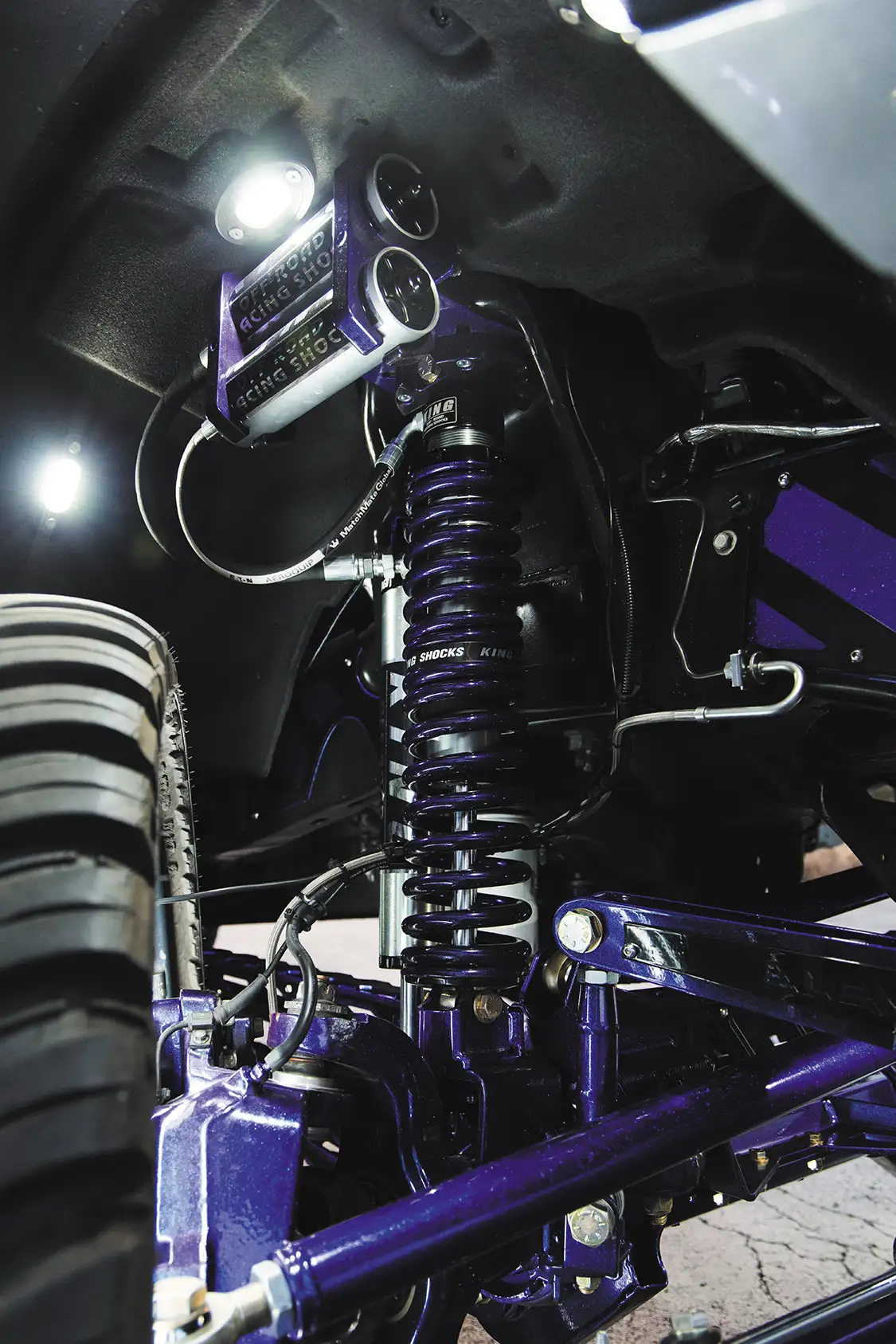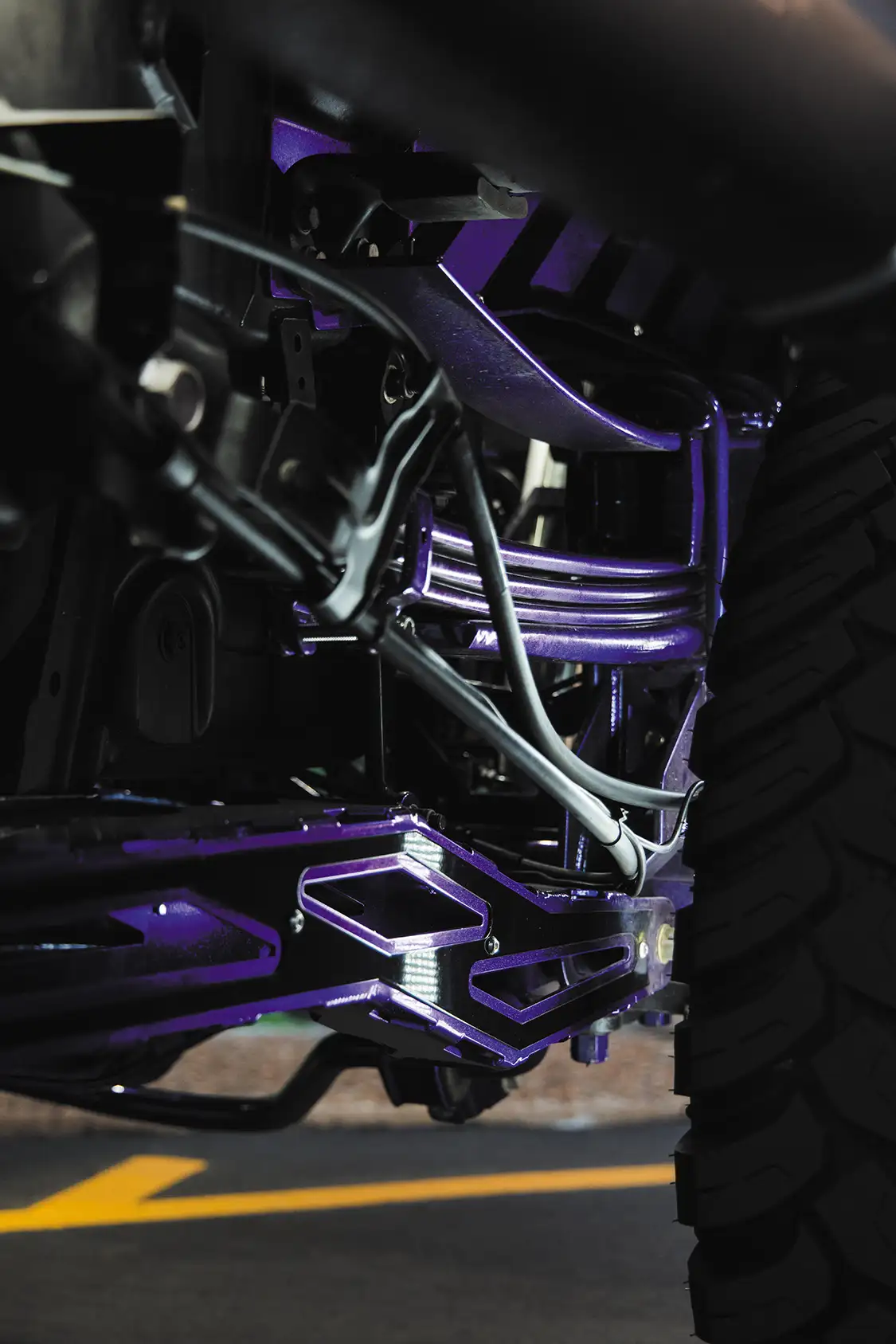One of the major aspects of the build was to increase the F-450’s ride height. To do this, Steve reached out to Big Shot Industries in Du Quoin, Illinois to not only handle the installation of the new chassis components, but to also powdercoat them all as well. The lift kit in question came from Elevate Suspension, and the finished color Steve had in mind for the parts was radical. A Thunderkiss base and a Dirty Magic topcoat from Prismatic Powders was expertly applied to the Elevate components, as well as the King coilovers and shocks. Powdercoating these pieces not only added a layer of protection to them but increased the impact they make with them being so much more visible due to the Ford’s increased altitude.