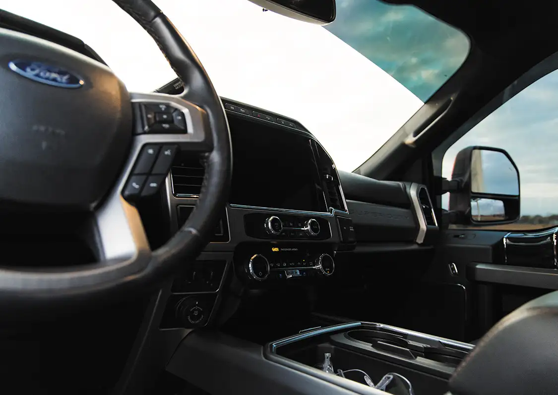 The fresh lift kit and rolling gear was enough to dramatically improve the looks and demeanor of the F-450, but Steve still had much more in store to alter its appearance. Heavy-duty, American-made Bodyguard Bumpers were selected to replace the factory units. The difference these things make is incredible. They’re just so visually striking—and built to last. Fitment is spot on with these things, and the utility of the front bumper with its mounting location for a light bar and grille guard option is extremely beneficial.  A Cervini’s cowl hood was next to find its way onto the F-450’s exterior landscape, as were Rek Gen mud flaps, and paint-matched accessories such as the headlights, taillights, and more. Increasing nighttime visibility and show-worthiness is a network of over 40 Beemer rock lights strategically positioned underneath the truck to properly highlight its impressive suspension setup. There’s absolutely no way of missing this truck whether it’s bombing down the highway or parked on full display at an event.