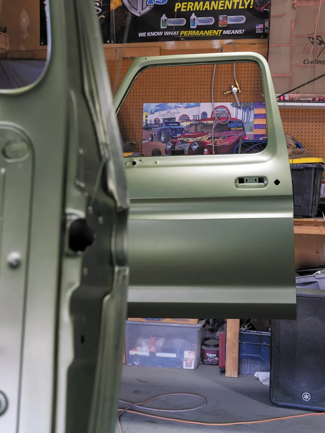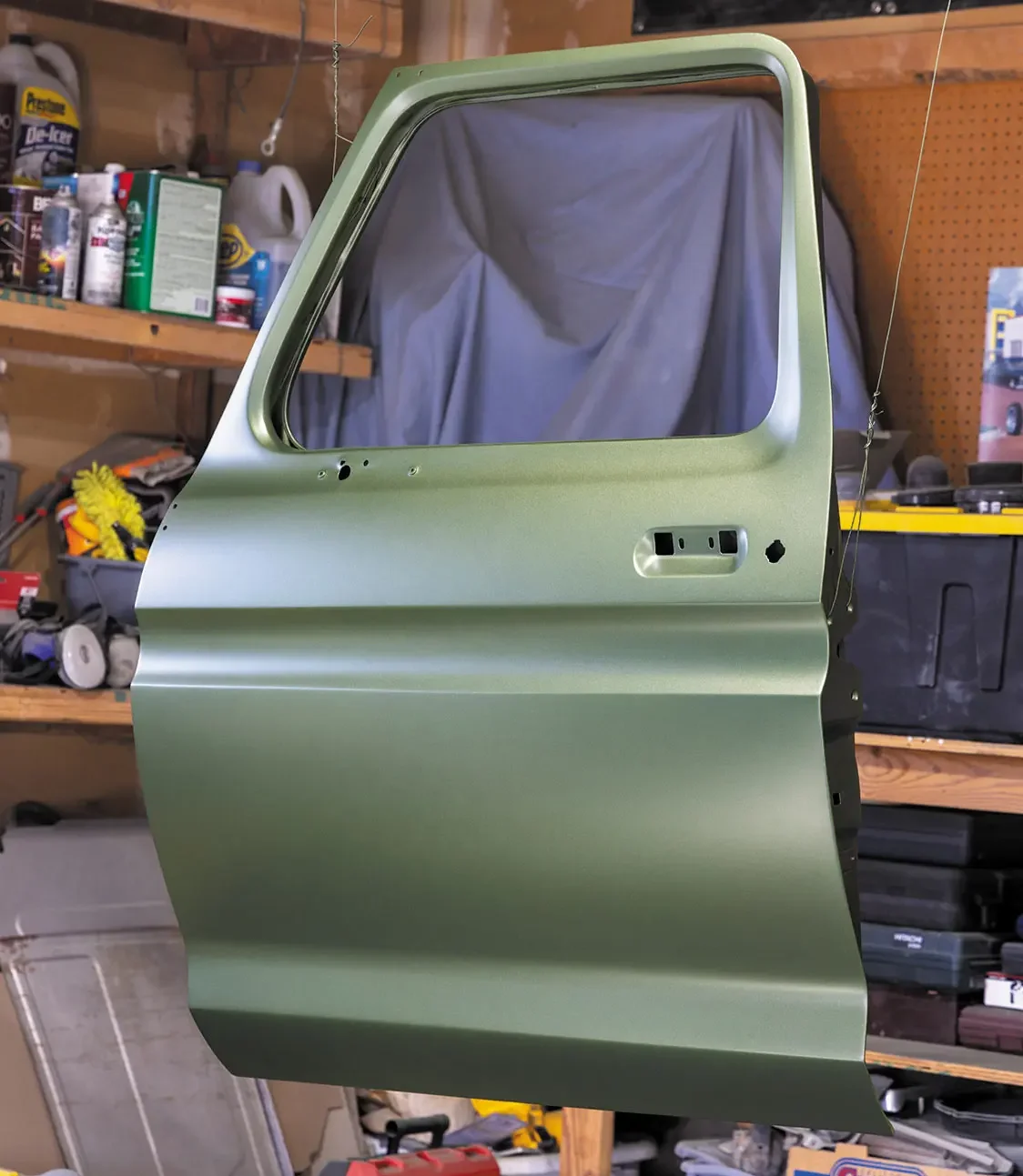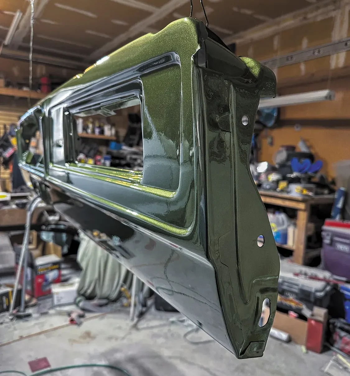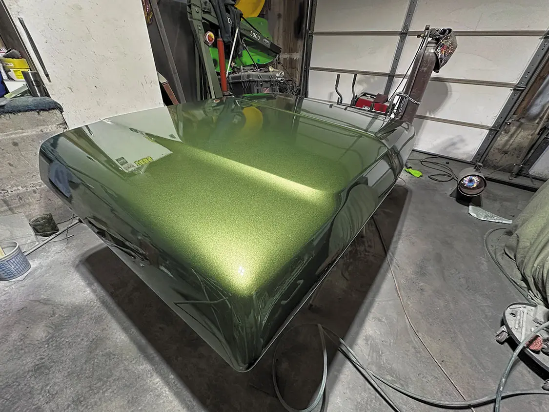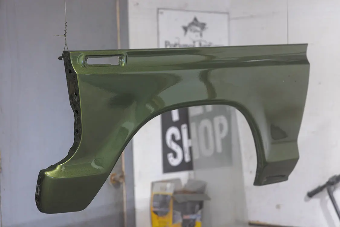 Over the last couple of months, I was able to get the fenders, hood, doors, and dash body-worked, blocked, and sprayed with color. The color we went with is Medium Green Metallic Glow, which was the color it came with from the factory. I have to say, when I was a kid I used to really not like the color, but as I started this project I figured it was only right to bring it back to its original glory. I’m not going to lie—now that I see it being laid down on the truck, I really like it. Next up will be the cab!