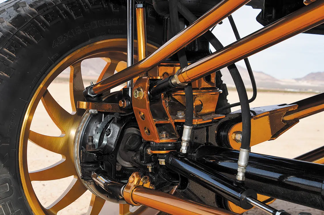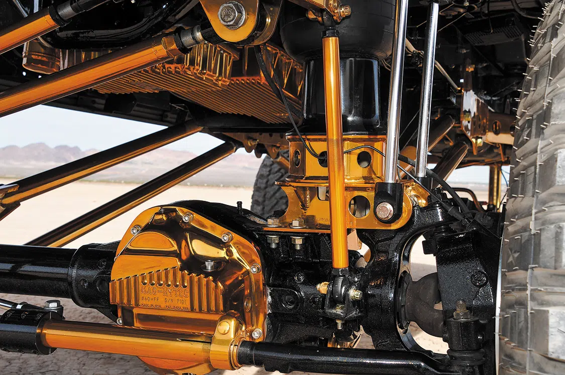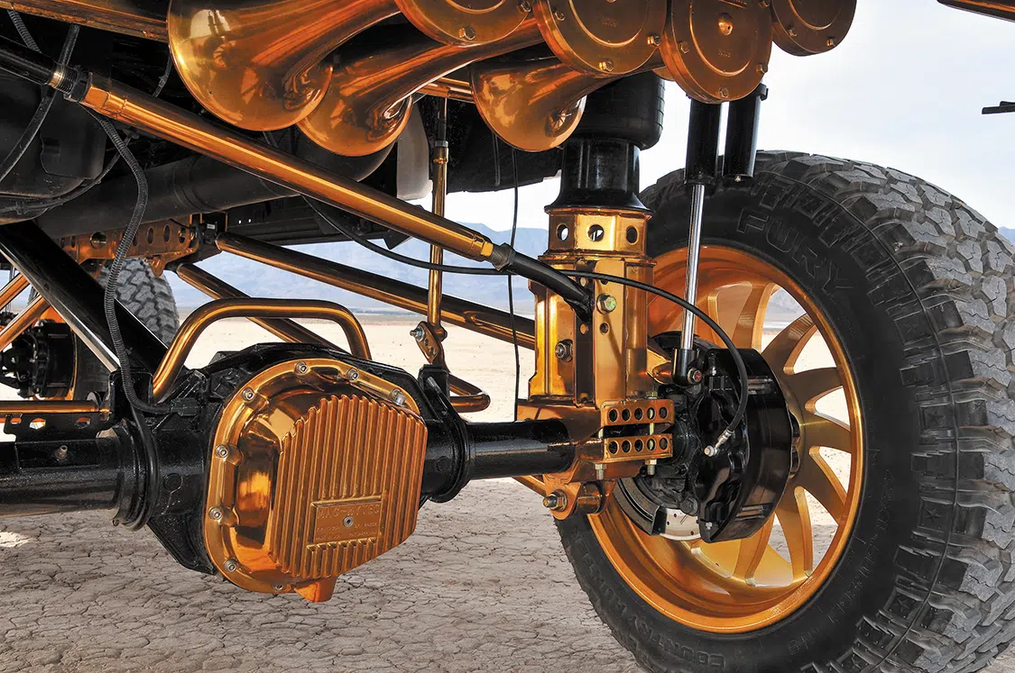 Every single piece that was added under the Ford was sent off to Economy Plating for chrome plating. Once they were chromed, Top Koat in Kennedale, Texas, was given the task of powdercoating all the chrome pieces in a bright gold. The suspension was installed starting with the subframe and then front to rear. Brackets were built for the air tanks so they could be shown off underneath the lifted Ford. Rigo and Manny supplied Nick with a Hornblaster kit that he had dipped in gold and mounted right below the tanks. With the suspension came a drop-down sway bar, but Nick didn’t like the look so he went with a Signature Metal Fab sway bar since it looked cleaner.