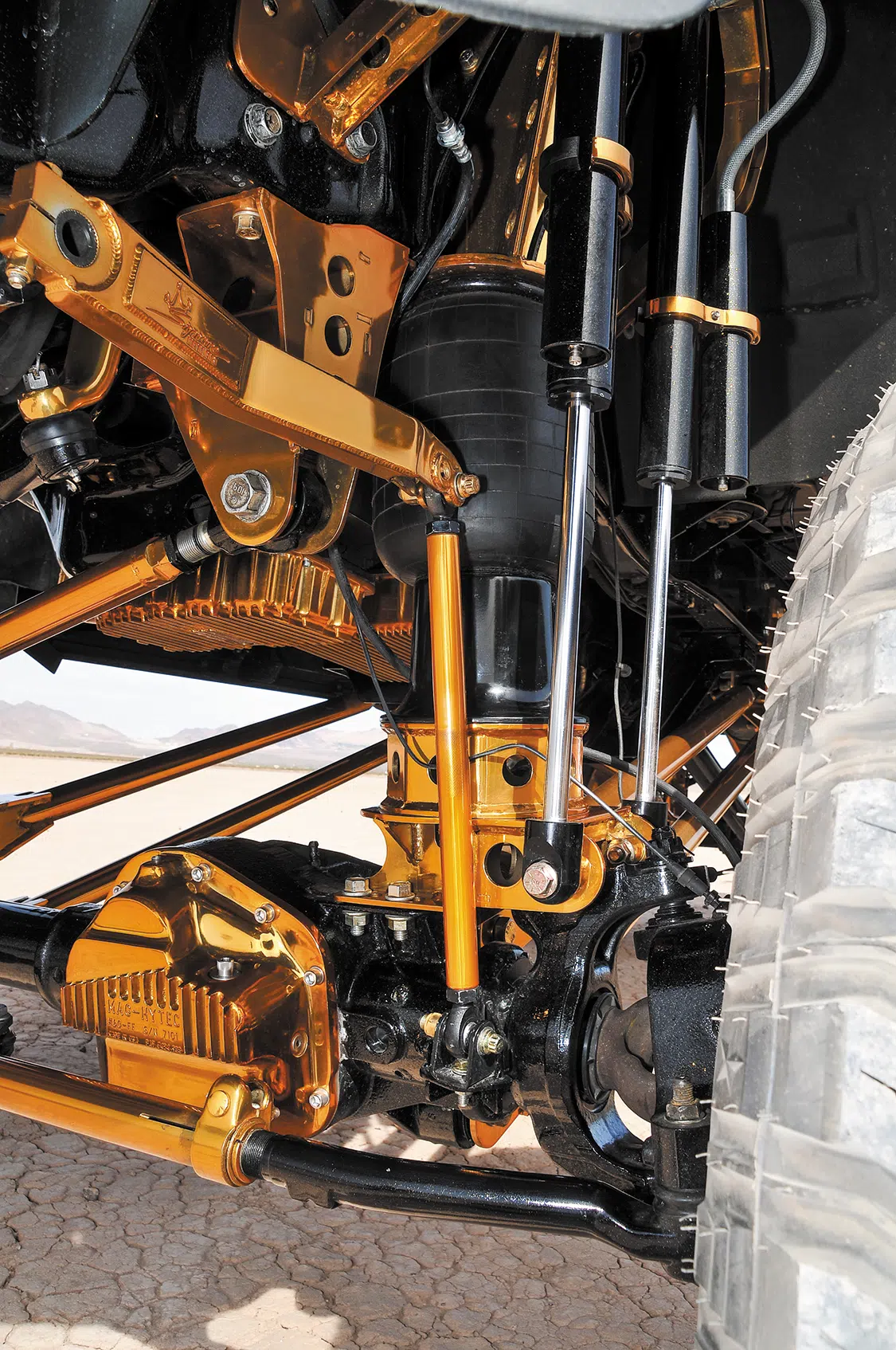 Rear Suspension: Firestone 5412 air bags, Ultimate Air Ride 12-18 inches, four seamless air tanks in gold, two Viair 485c compressors, FOA shocks, Airlift P3H air management system installed by Texas Born Performance