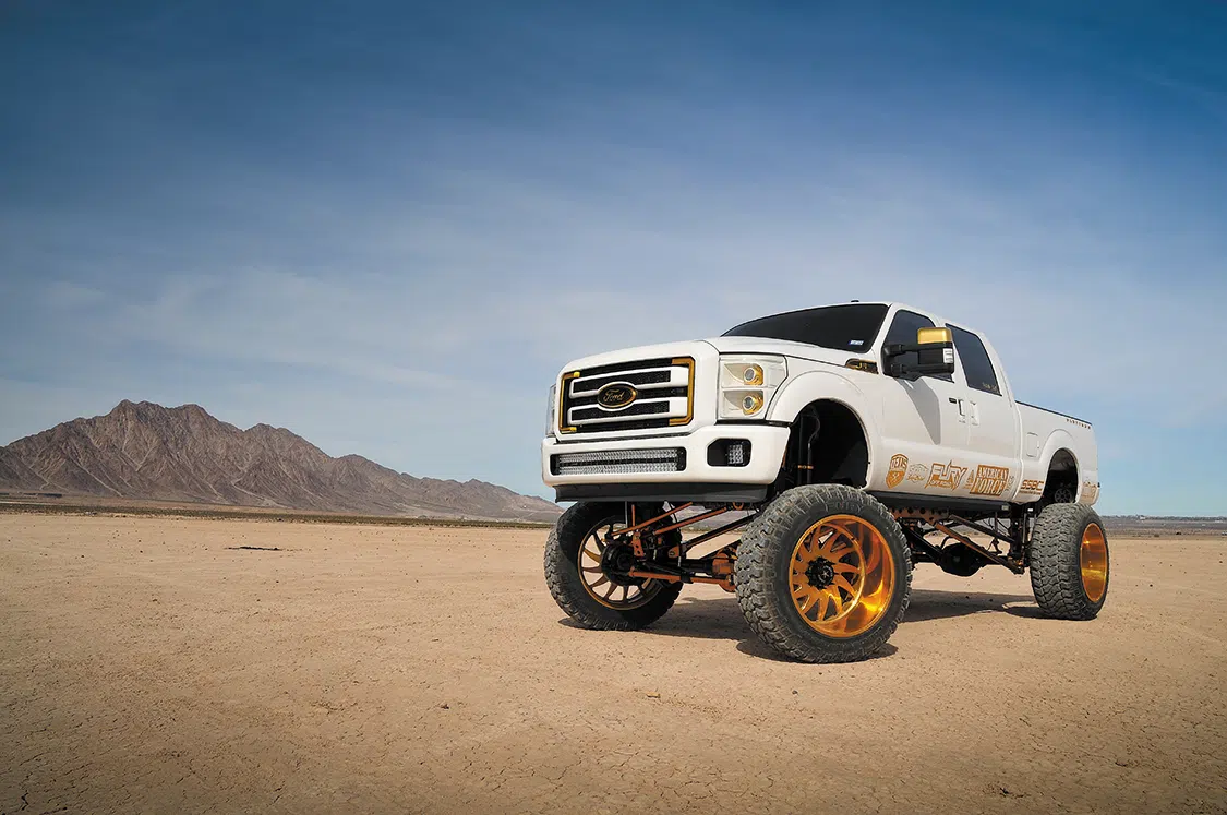 Once the adjustable hydraulic lift was installed and working, Kaly Doyle of KD Designs brought the F-250 into the paint booth and added a white pearl paint with gold metal flake throughout. After the motor was dropped back into the newly lifted truck, Hunter, Nick, and Nick’s father, Steve, added the H&S 64mm turbo kit with No Limit CVC and EGR delete. Everything that could be changed was touched in gold for added affect. Nick went with SSBC 8-piston brake setup for better stopping power on the larger and heavier truck. For the exterior additions, a custom bracket was made and two off-road 30-inch light bars were mounted in the grille behind the mesh and bumper. Thirty-two rock lights were added to showcase the undercarriage at night and indoors.