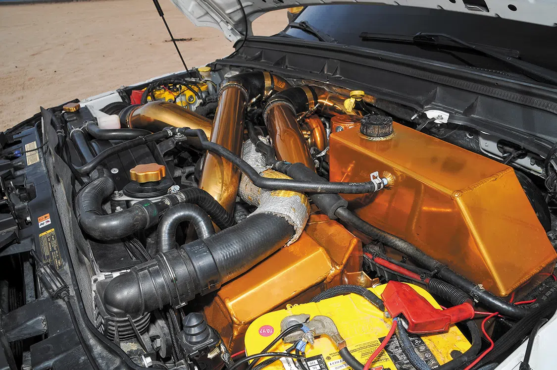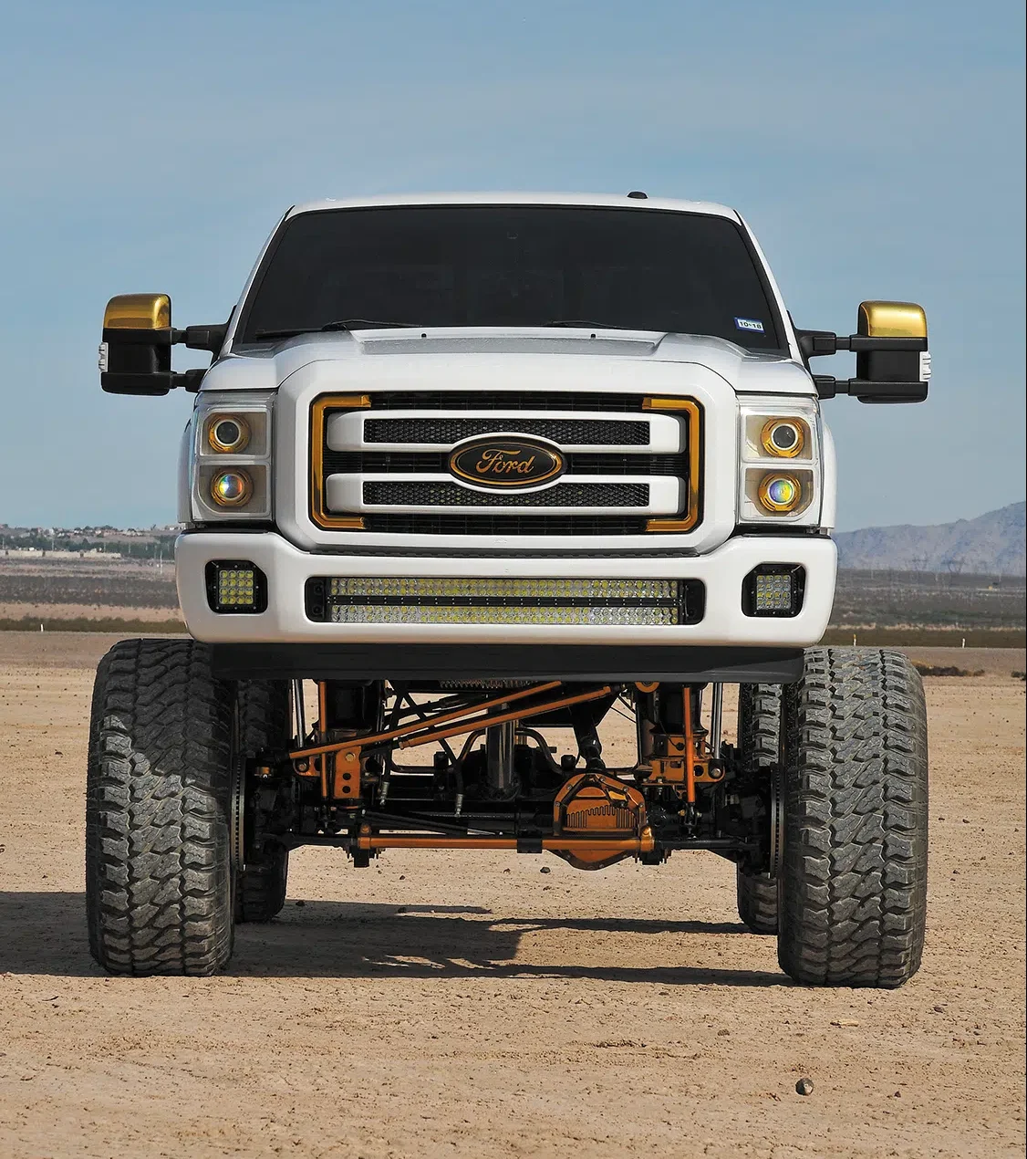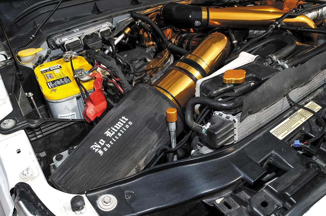 Engine: 6.7L turbo diesel, deleted, No Limit intercooler in gold, No Limit intake Stage 2, No Limit CCV in gold, No Limit EGR in gold, No Limit coolant tank in gold, No Limit cap kit in gold, H&S 64mm turbo kit, pipes and turbo in gold, manifold painted high temp black, Spartan tunes, EZ-Lynk, Flo Pro 5-inch downpipe, Tro exhaust tip in gold, all done by Texas Born Performance, SSBC B8 Barbarian 8-piston calipers, drilled and slotted rotors, Mag Hytec front and rear differential in gold, Mag Hytec transmission pan