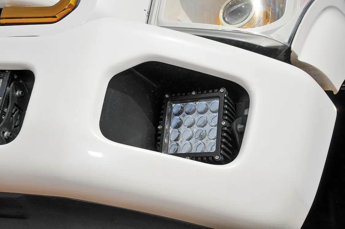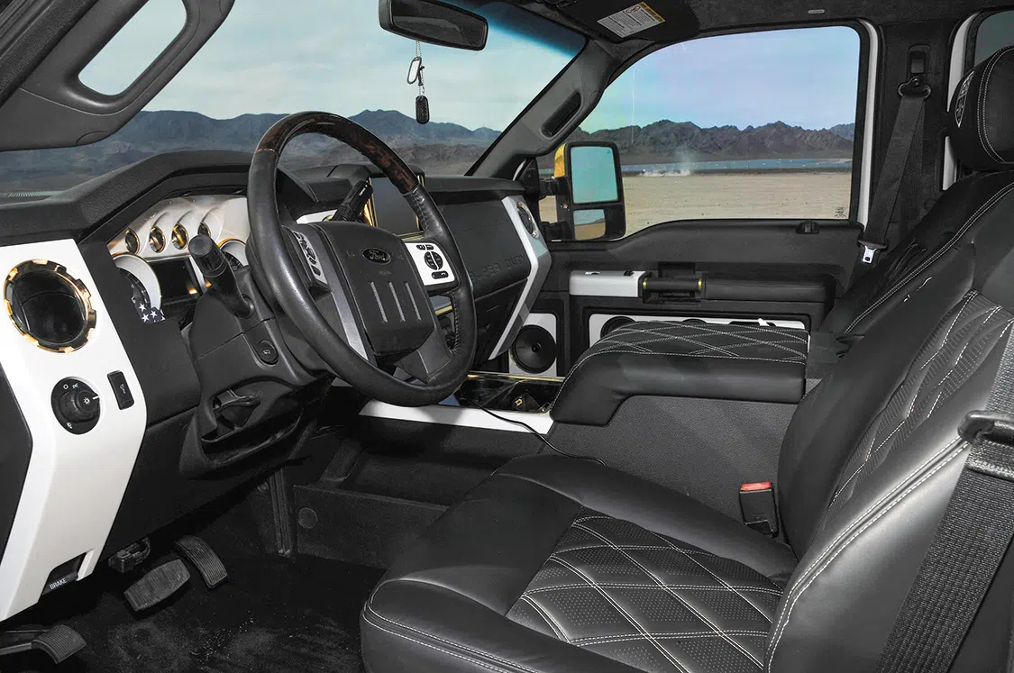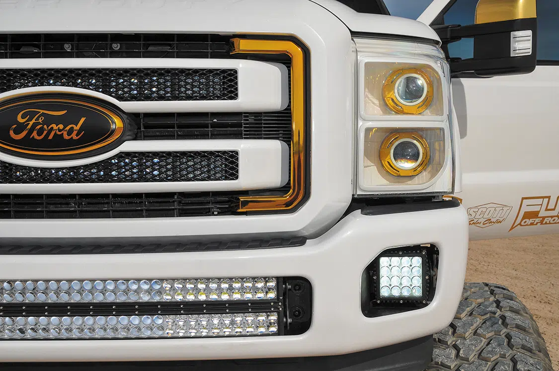 Once the adjustable hydraulic lift was installed and working, Kaly Doyle of KD Designs brought the F-250 into the paint booth and added a white pearl paint with gold metal flake throughout. After the motor was dropped back into the newly lifted truck, Hunter, Nick, and Nick’s father, Steve, added the H&S 64mm turbo kit with No Limit CVC and EGR delete. Everything that could be changed was touched in gold for added affect. Nick went with SSBC 8-piston brake setup for better stopping power on the larger and heavier truck. For the exterior additions, a custom bracket was made and two off-road 30-inch light bars were mounted in the grille behind the mesh and bumper. Thirty-two rock lights were added to showcase the undercarriage at night and indoors.