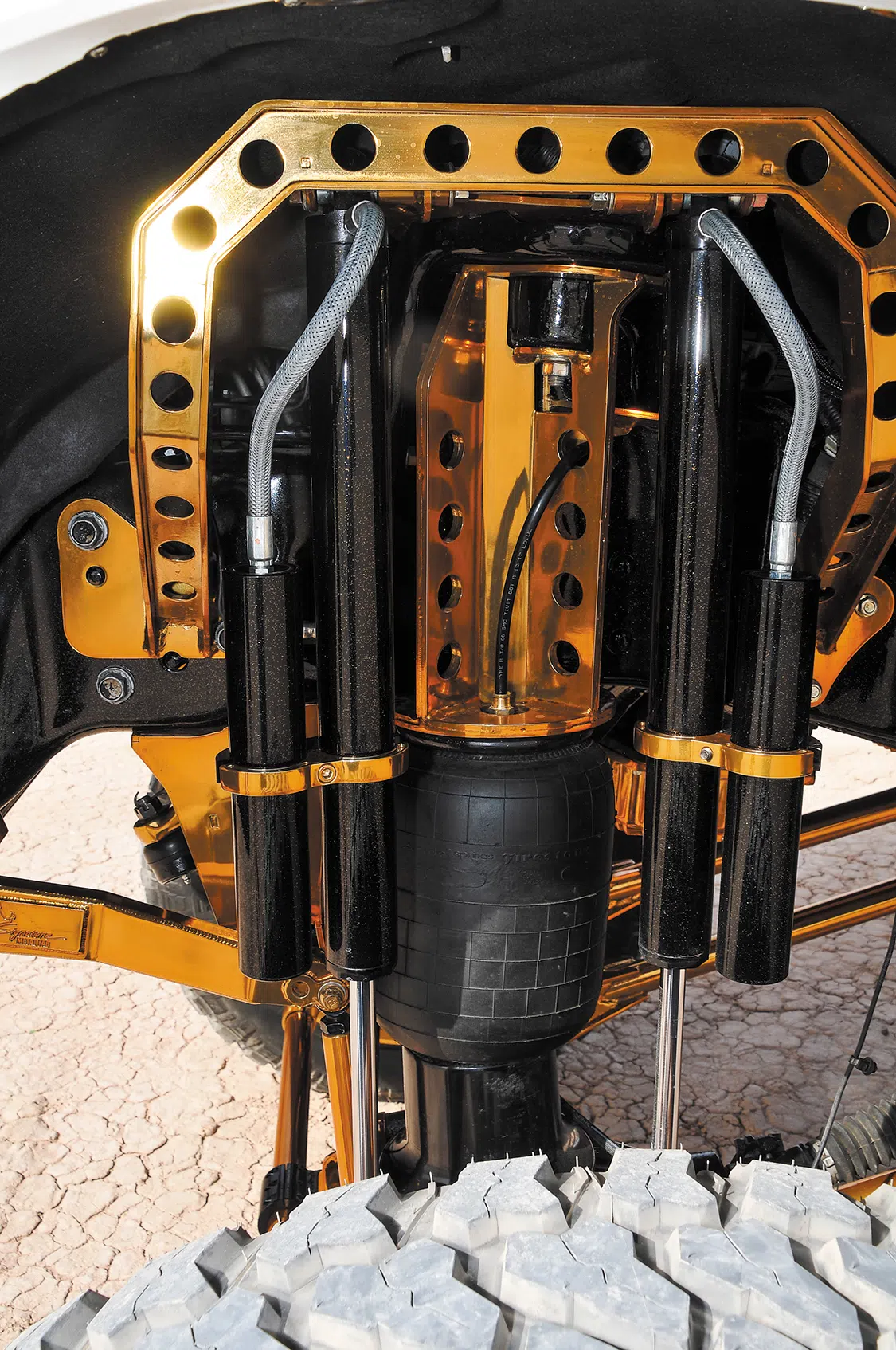 Rear Suspension: Firestone 5412 air bags, Ultimate Air Ride 12-18 inches, four seamless air tanks in gold, two Viair 485c compressors, FOA shocks, Airlift P3H air management system installed by Texas Born Performance