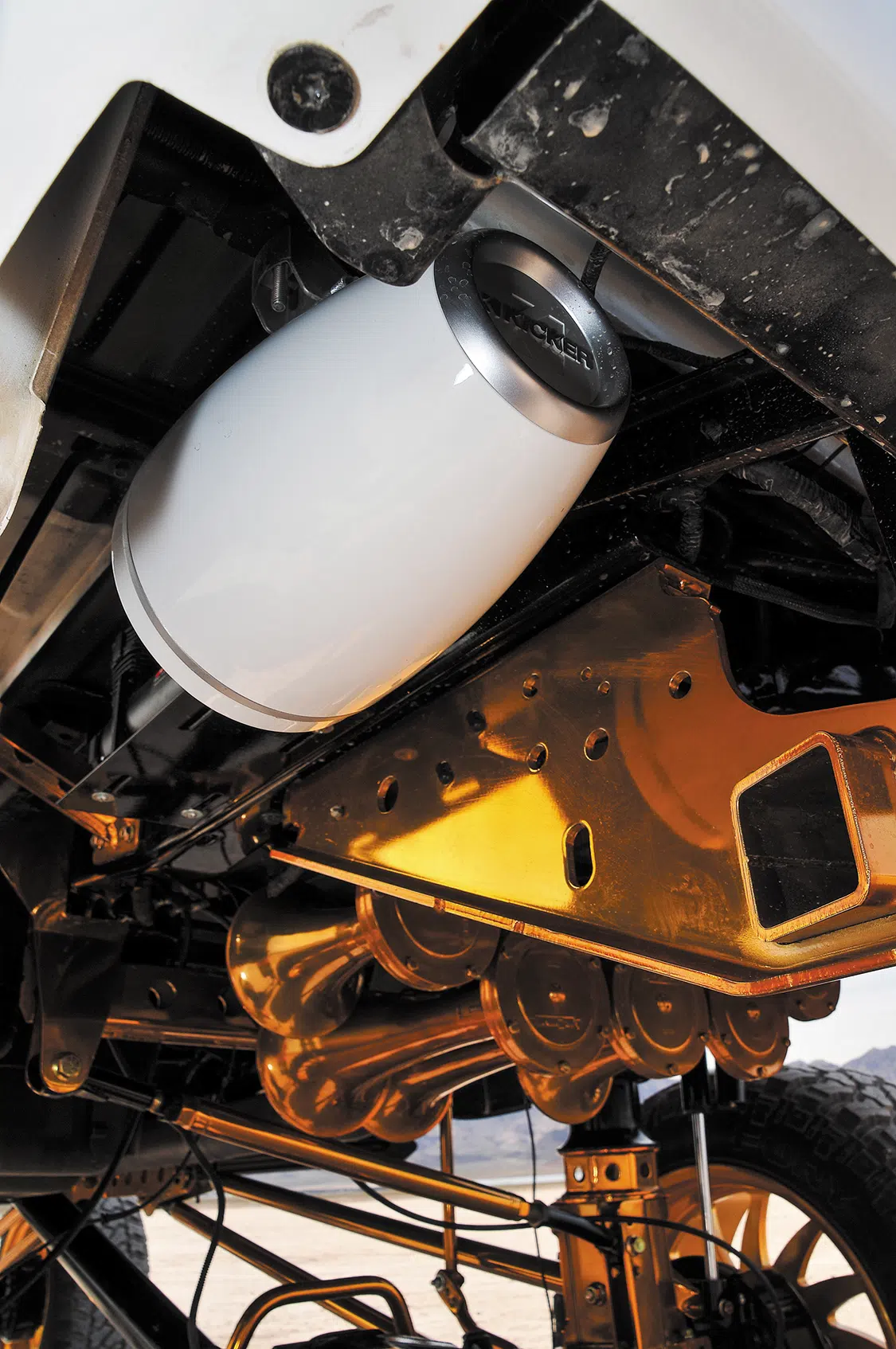 Every single piece that was added under the Ford was sent off to Economy Plating for chrome plating. Once they were chromed, Top Koat in Kennedale, Texas, was given the task of powdercoating all the chrome pieces in a bright gold. The suspension was installed starting with the subframe and then front to rear. Brackets were built for the air tanks so they could be shown off underneath the lifted Ford. Rigo and Manny supplied Nick with a Hornblaster kit that he had dipped in gold and mounted right below the tanks. With the suspension came a drop-down sway bar, but Nick didn’t like the look so he went with a Signature Metal Fab sway bar since it looked cleaner.