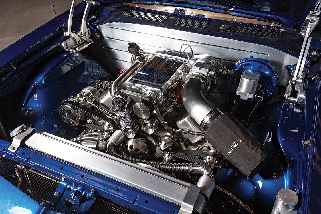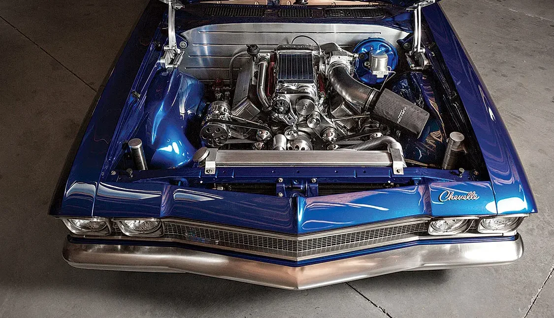 The outside of the car shows a lot of class and a hint of attitude, but pop the hood and you’ll reveal a true monster. A Turn Key Engine 740-hp Kenne Bell supercharged LS2 was dropped in to provide a massive amount of power and modern reliability. To cool down the engine on hot Phoenix days (and let’s face it, nights, too), a Ron Davis radiator and a custom intercooler were installed. Providing cooling for the Chevelle’s occupants is a full Vintage Air Gen IV A/C unit complete with Front Runner accessory drive. Every wire was hidden, and anything that could be was plated in brushed nickel. A TCI six-speed automatic transmission backs up the powerful modern engine and once the pedal is pushed to the floor, a custom-tuned stainless exhaust system from Magnaflow expels spent gasses.