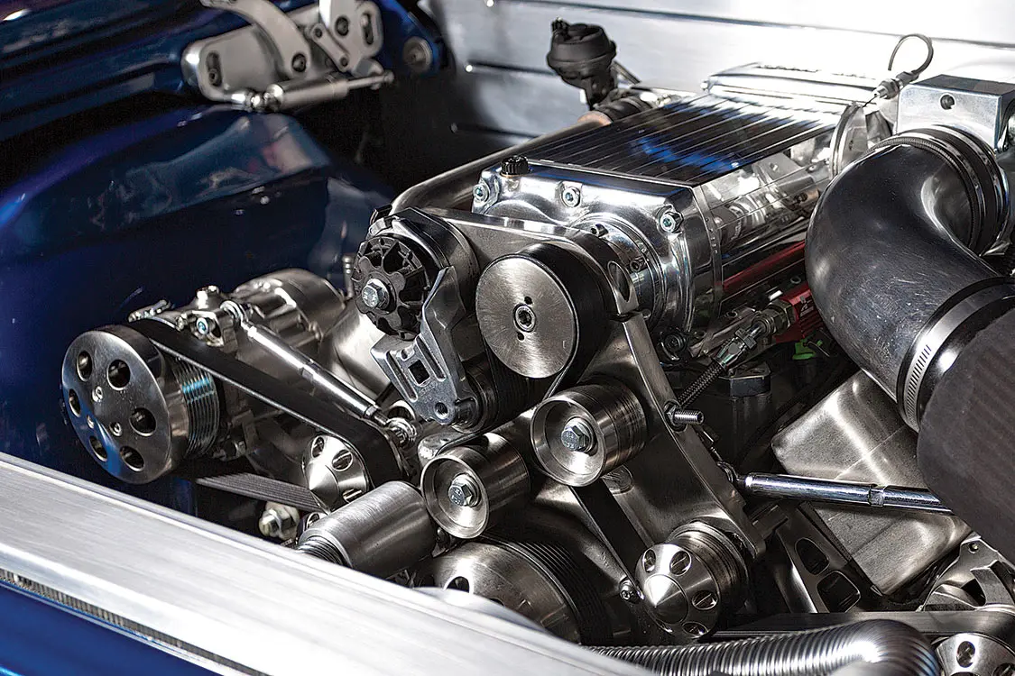 740-hp LS2, Kenne Bell supercharger, brushed nickel accessories, TCI six-speed transmission, Mooneyes pushbutton shifter, Vintage Air front runner, Magnaflow stainless steel exhaust, Ron Davis radiator, custom intercooler, Painless Performance wiring, Kinetik HC2000 batteries