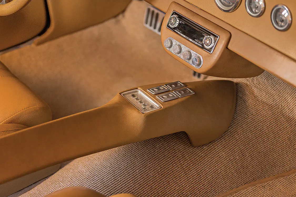 Custom door panels, custom dash, Classic Instrument gauges, custom floating center console, Vintage Air Gen IV A/C, Glide Engineering bucket seats, Bentley leather, ididit steering column, Budnik Revolver steering wheel, Rockford Fosgate sound system, Dynamat sound deadener