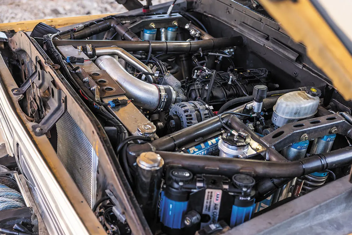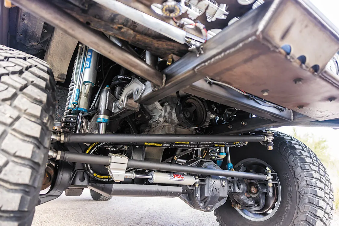 On-board ARB air compressor, 2012 GM 6L90 transmission, 14×16-inch CBR transmission cooler, Heavy-duty NP205 transfer case with an Offroad Design Magnum underdrive adding up to a 5.33:1 final low-range drive ratio, Tom Wood’s front and rear driveshafts, 2014 Ford F350 Super Duty Dana 60 front axle, 2014 Ford F350 shaved Sterling 10.5 rear axle, 4.88 front and rear gears, Electronic lockers both front and rear, 2014 Super Duty brakes front and rear, GM Hydroboost master cylinder, Proportioning valve and line lock