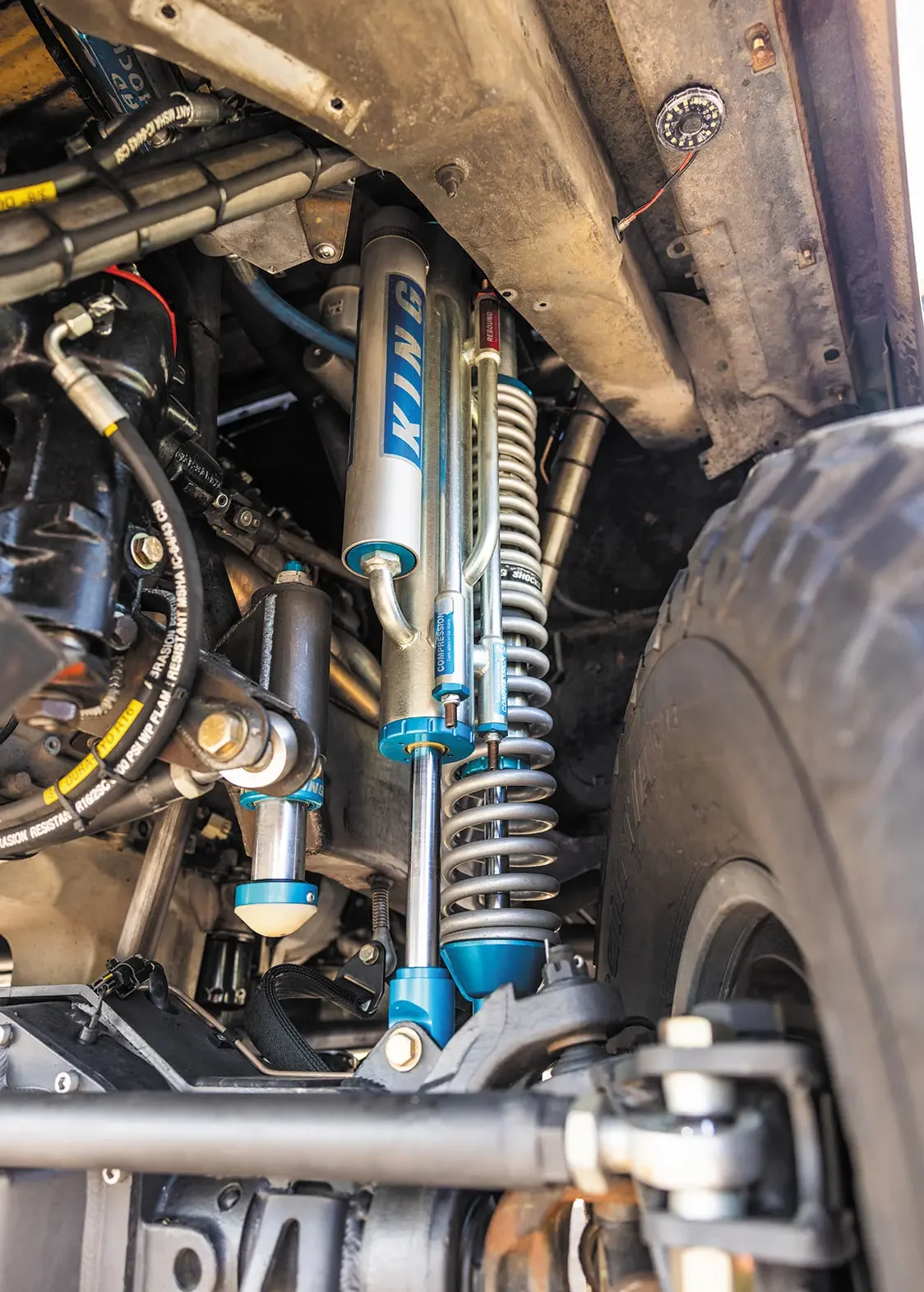 1976 Ford frame cut and notched by M-Fab, Custom integrated cage, 144-inch wheelbase, Custom 3-link suspension lift by M-Fab, Eibach front and rear springs, King front and rear shocks, custom tuned by KDM,Red-Head F-150 ported steering box, PSC hydraulic-assist steering stabilizer