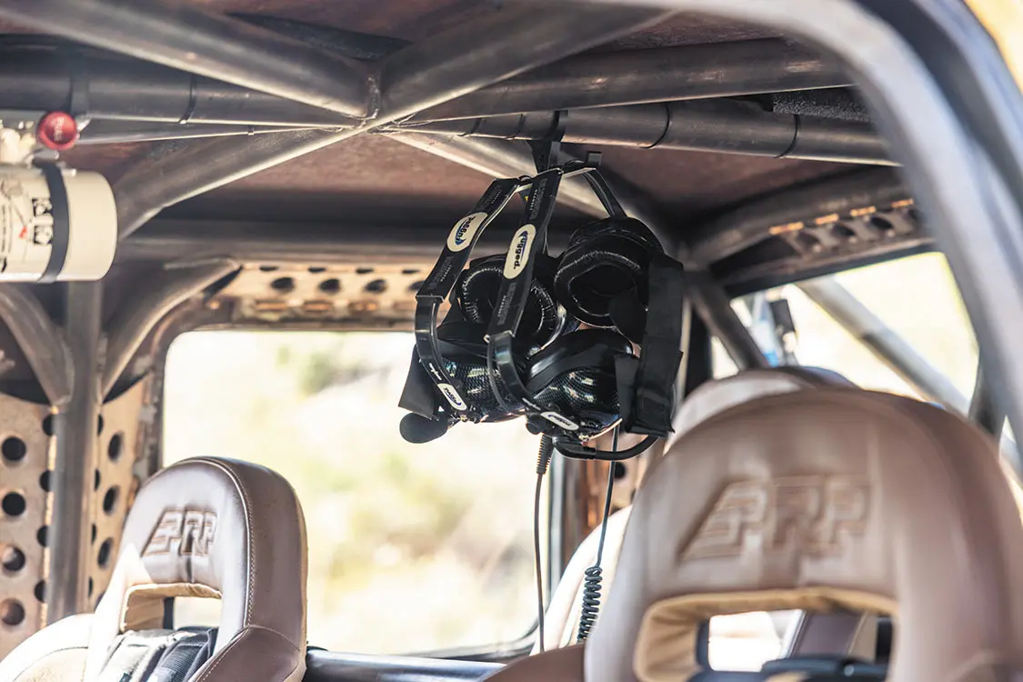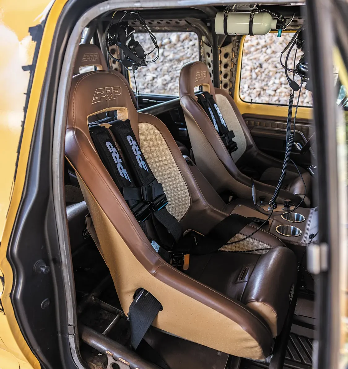 Custom brown and tan upholstered PRP suspension seats, Matching brown and tan center console, door panels and dash, M-Fab roll cage, AEM Electronics digital gauges, MOMO California Wood, Heritage steering wheel, Full Rugged Radios communication system with headsets, On-board refrigerator/freezer