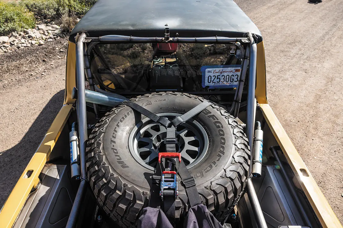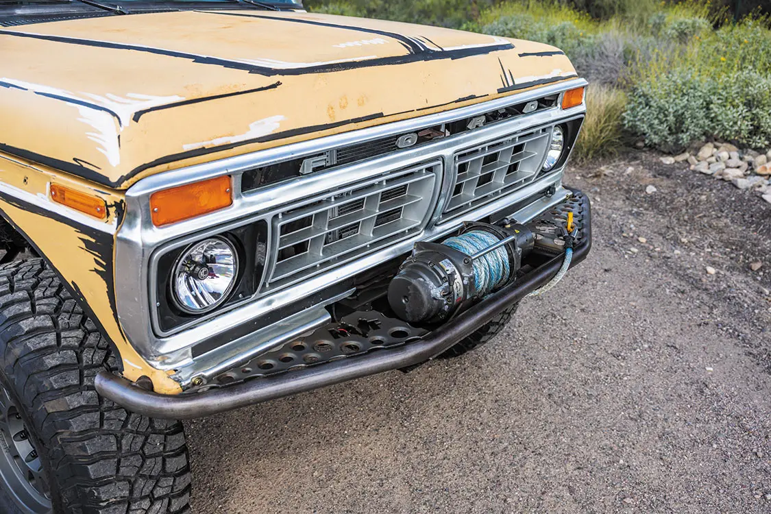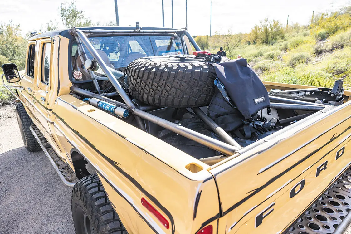 A 1975-1977 Ford F-Series grille, custom tube bumpers and rock sliders, and a custom integrated spare tire rack over the truck’s bobbed bed add to the build’s rugged appearance. Cutout wheel wells make for better tire clearance as well as less rubbing and denting of body panels from off-road shenanigans. Speaking of off-road shenanigans, Jerry’s upgraded lighting system, which includes 7-inch KC HiLiTES Gravity LED Pro headlights, a KC light bar above the truck’s cab, and 30 rock lights throughout the body help light the way for just about any after-dark adventure Jerry may want to go on, including those races in Baja we spoke about earlier.