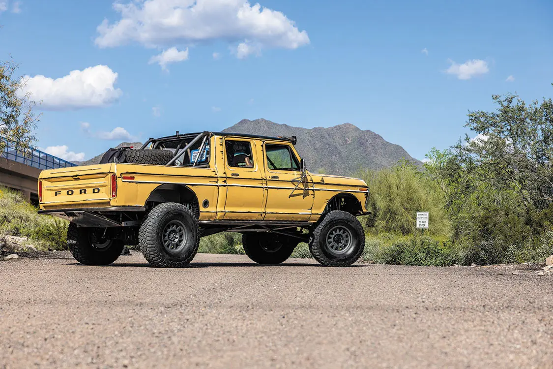 1975-1977 Ford F-Series grille, Custom tube bumpers, Custom tube rock sliders, Custom spare tire wrack integrated into the rollcage, Cut-out wheel wells, Bobbed bed , 7-inch KC HiLiTES, Gravity LED Pro headlights, KC HiLiTES light bar, 30 KC rock lights, Ford Vineyard Yellow paint with black and white “cartoon-like” accents, all done by Jerry