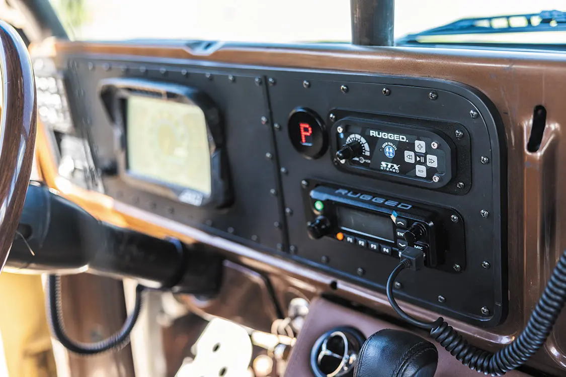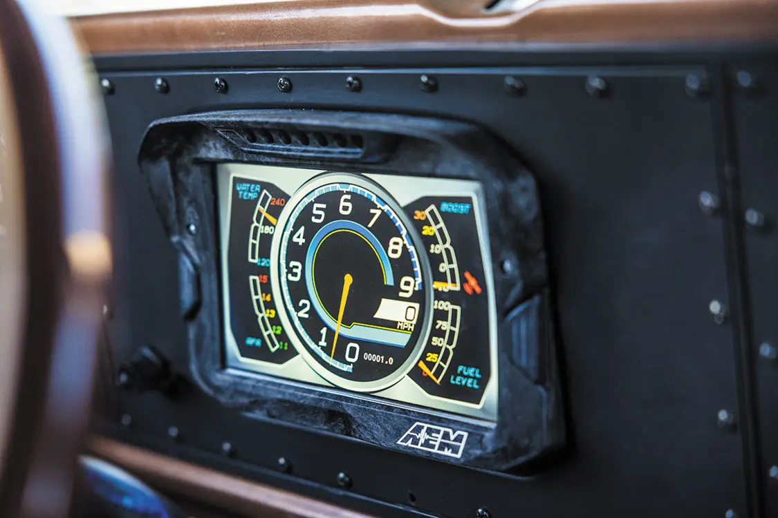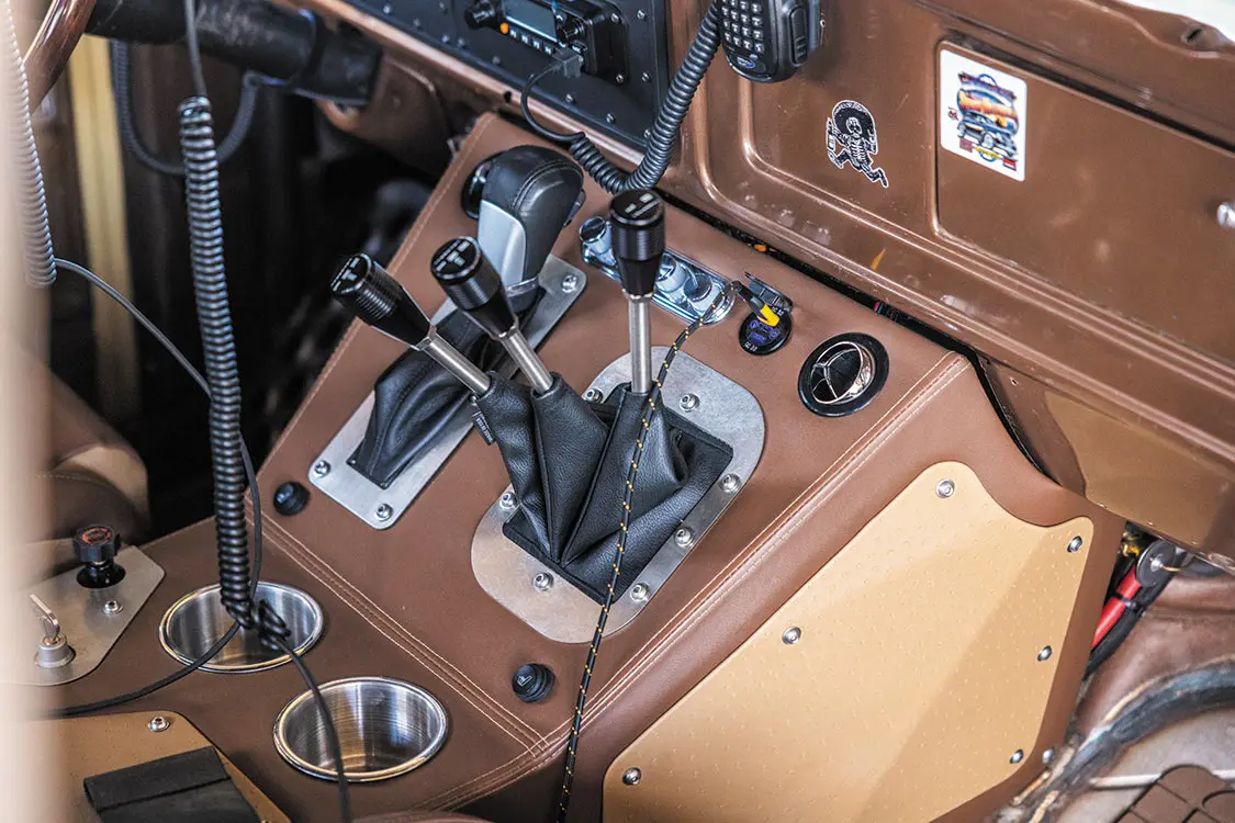 Inside, the truck is just as custom, with brown and tan PRP suspension seats, as well as a matching center console, door panels, and dash, bringing the old-west vibe of the truck’s exterior from outside in. As discussed before, an M-Fab rollcage is continued throughout, while a full Rugged Radios communication system with headsets guarantees proper communication between the driver and the passenger, whether they are out night wheeling, enjoying an event, or racing in Mexico. Other interior features include AEM Electronics digital gauges, a MOMO California Wood Heritage steering wheel, and an on-board refrigerator/freezer.