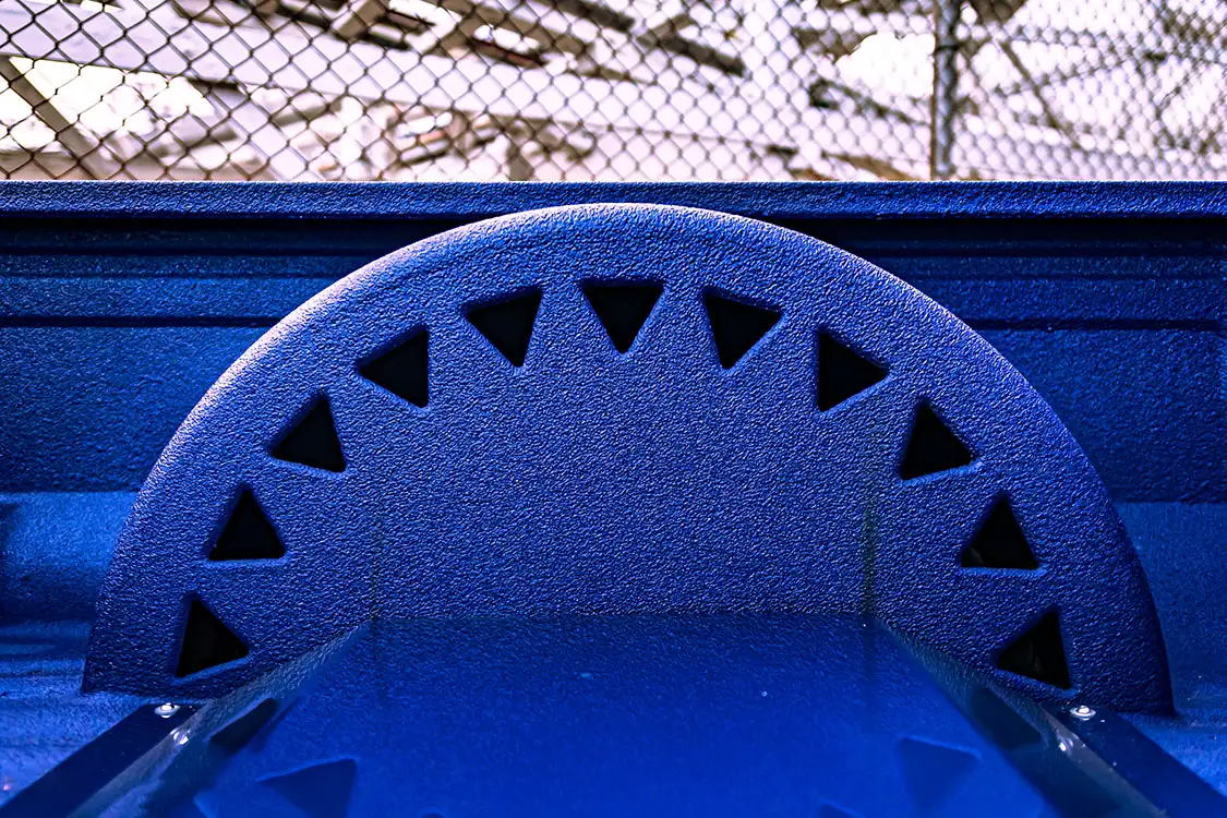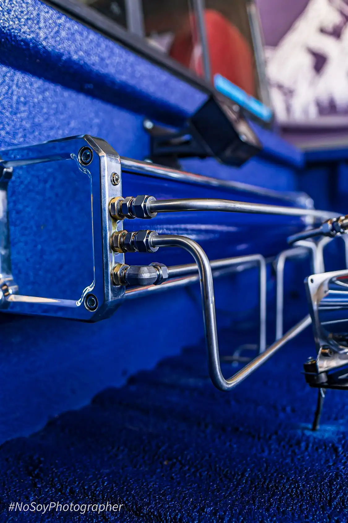 Underneath the truck, you’ll find custom wheel tubs in the front, built by Uneekbilt, along with custom slotted tubs in the rear, which take this truck up a notch completely. From under the hood to riding in the bed, these custom wheel tubs allow Larry to run wide wheels and tires on the truck, while also making room for the bagged suspension system. But the tubs add even more aesthetically, including a nice trimmed silhouette and even more custom flair to the Line-X-sprayed bed. The whole truck is finished off in stunning Viper Blue paint, laid by Mathew Lowe.