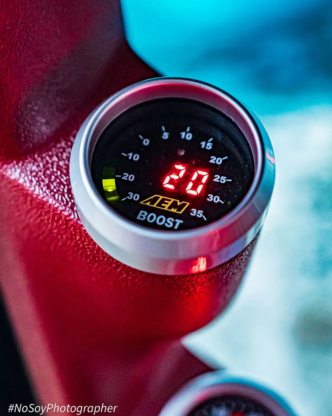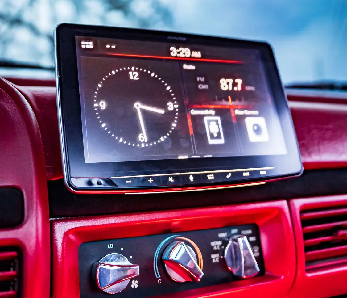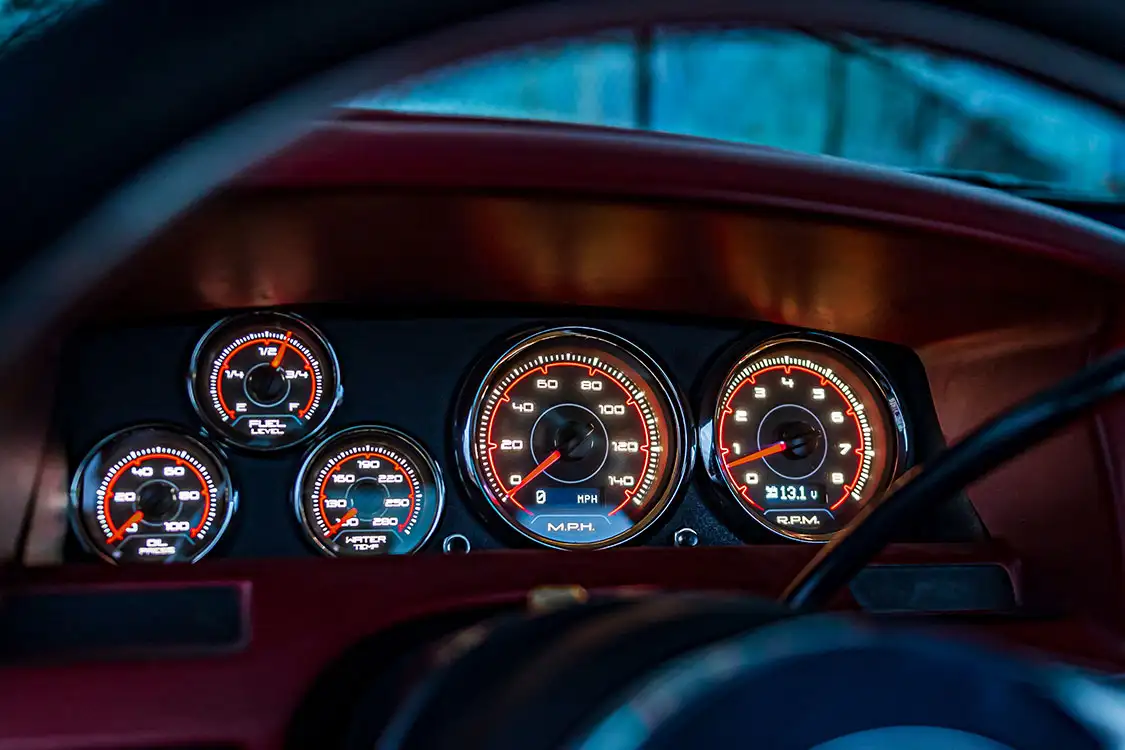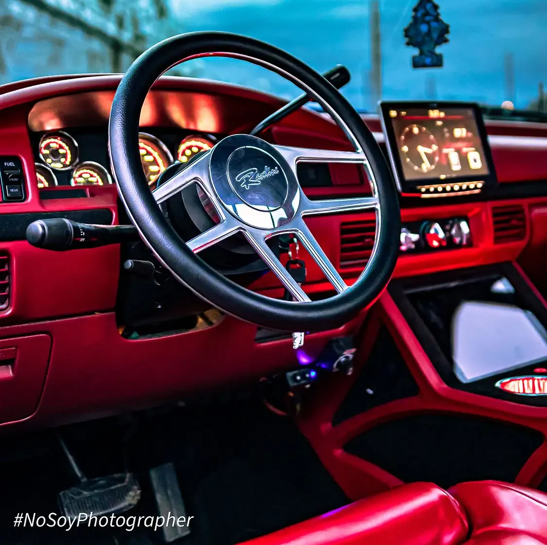 While Larry wanted to maintain much of his truck’s classic body style, one look inside and you’ll notice a full transformation from stock-level to a fully custom interior. Featuring SEM Portal Red paint with black accents, the Lightning’s interior includes red leather-wrapped seats and a custom center console, as well as a custom Alcantara-wrapped headliner, dash and door panel components done by Larry himself. All of the truck’s instrumentation has been upgraded to New Vintage USA F-Series gauges with additional AEM fuel, boost and airflow gauges, while an Alpine digital head unit sits center-stage at the truck’s full Rockford Fosgate stereo system.