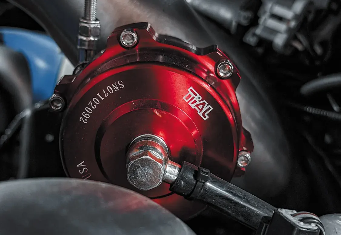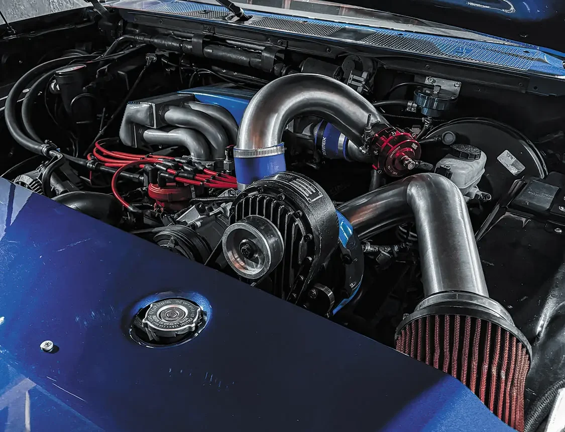 Just like with any factory Lightning, you’ll find a Ford 351ci Windsor V-8 under this truck’s hood, but with some impressive upgrades, the utmost being a Powerdyne blower pushing 10psi. The engine also features a timing gear drive set, MSD 6AL ignition box with timing retard, a custom auxiliary fuel pump kit, and BBK Performance 1-¾-inch headers dumping into a full Cherry Bomb dual exhaust system. Backing the V-8 is one of Ford’s finest transmissions—a heavy-duty E40D 4-speed automatic, tied to a custom driveshaft and a shortened differential, the latter built by GS Customs.