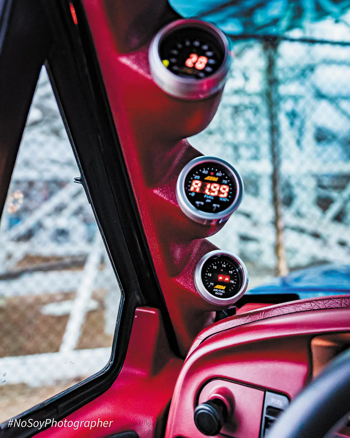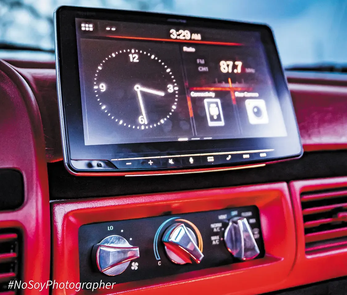 While Larry wanted to maintain much of his truck’s classic body style, one look inside and you’ll notice a full transformation from stock-level to a fully custom interior. Featuring SEM Portal Red paint with black accents, the Lightning’s interior includes red leather-wrapped seats and a custom center console, as well as a custom Alcantara-wrapped headliner, dash and door panel components done by Larry himself. All of the truck’s instrumentation has been upgraded to New Vintage USA F-Series gauges with additional AEM fuel, boost and airflow gauges, while an Alpine digital head unit sits center-stage at the truck’s full Rockford Fosgate stereo system.