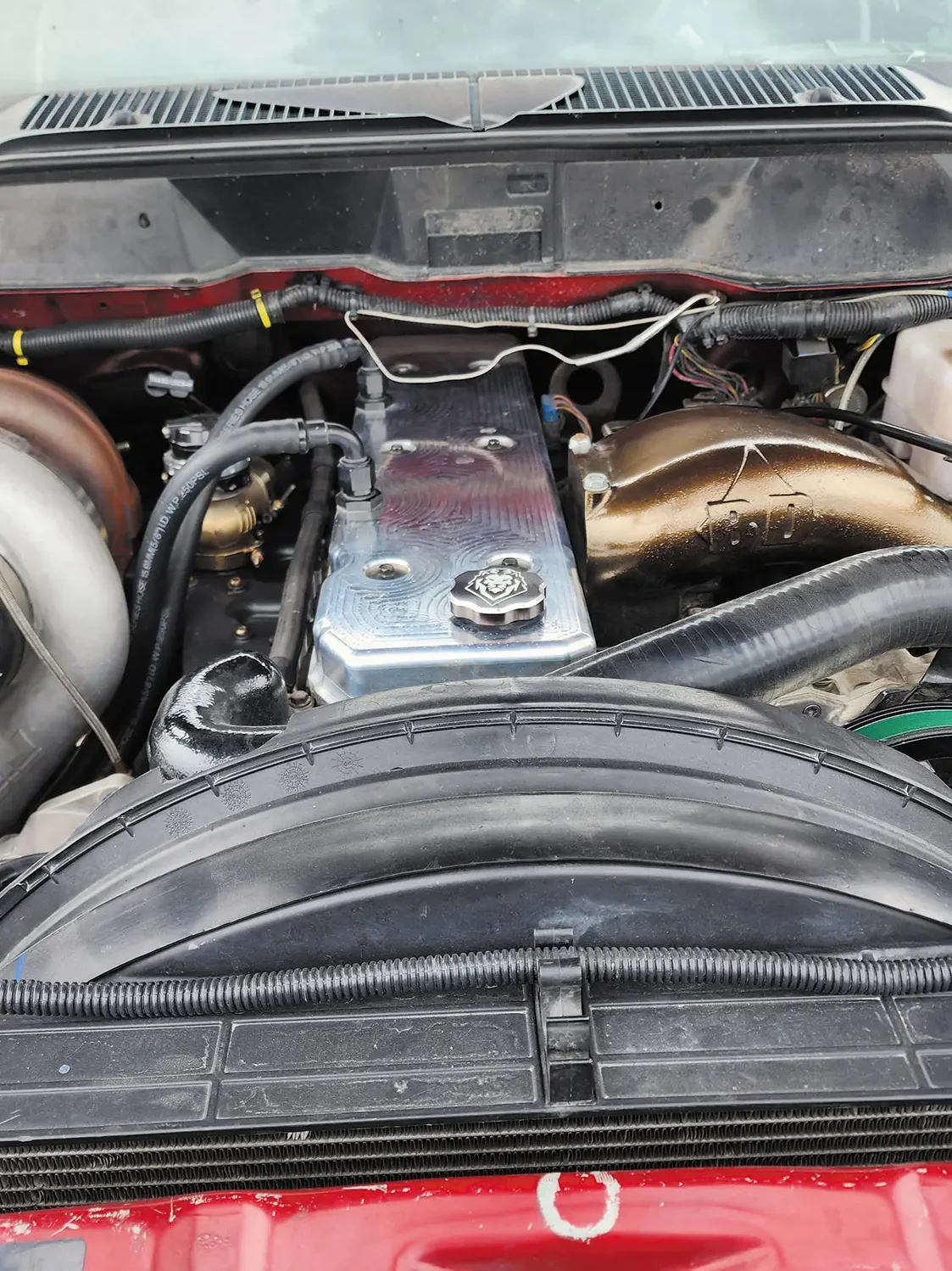 “It started off five years ago as a mega cab that needed fixing. I bought it to tow my Jeep to off-road sites. Once I started messing with it I ended up building it up. It went from a simple built tranny (that I built with a friend), and an s369 to support winning comps and small single. That all lead up to building a mega with a shredder series short block, stage 3 head from Scheid and huge air, s476 feeding a Forced Inductions GTR110 mm turbo, and 3 kits of nitrous.”
