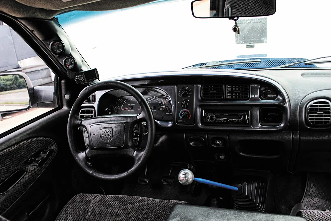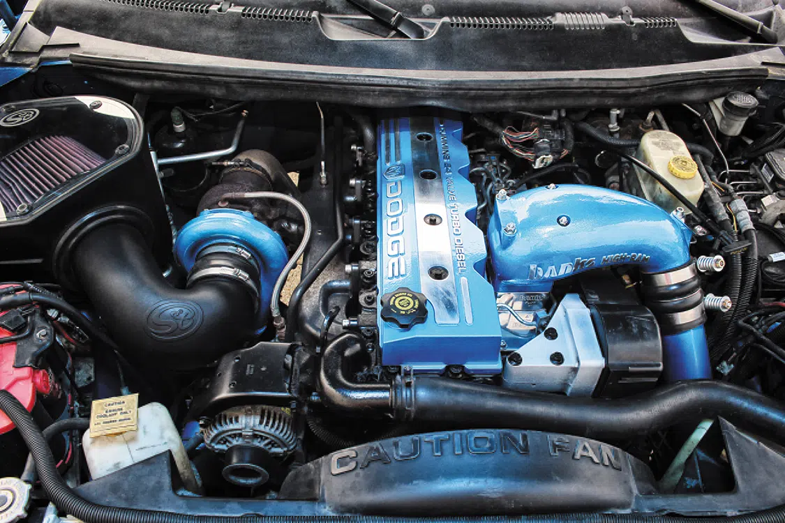 Despite the 24-valve Cummins in Michael Asher’s ’01 Dodge being pulled and resealed by the truck’s previous owner, all the performance-related work on the engine has been done in recent years. Thanks to the help of nearby E&M Repair and Fabrication, the cylinder head was pulled, decked, and fitted with Haisley Machine 90-pound valve springs prior to being reinstalled using H11 head studs. To date, the 285,000-mile factory bottom end has gone untouched. AE Concepts did all of the under hood powder coating, along with the control arms, traction bars, coil springs, and shift stalk.