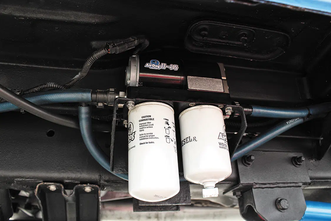Keeping the VP44 healthy is an AirDog II-4G 165-gph fuel system. Michael keeps supply pressure set to 18 psi and also opted for AirDog’s low pressure indicator light kit, which illuminates when fuel pressure drops to 10 psi or lower.