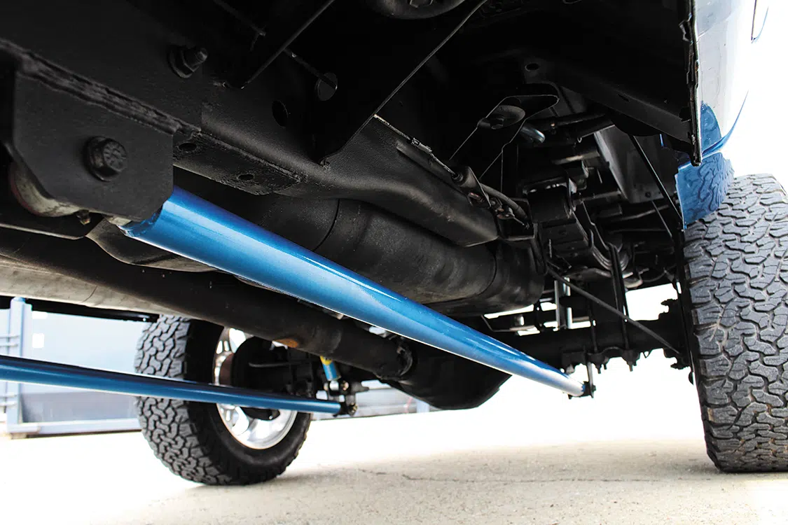 Using 1.75-inch of tubing and heavy-duty, greasable joints from Ballistic Fabrication, E&M Repair and Fabrication built Michael a stout set of traction bars. The bars attach to the frame via bolt-on brackets, but because of the flex that sometimes occurs with U-bolts, the axle mounts are welded to the tubes.