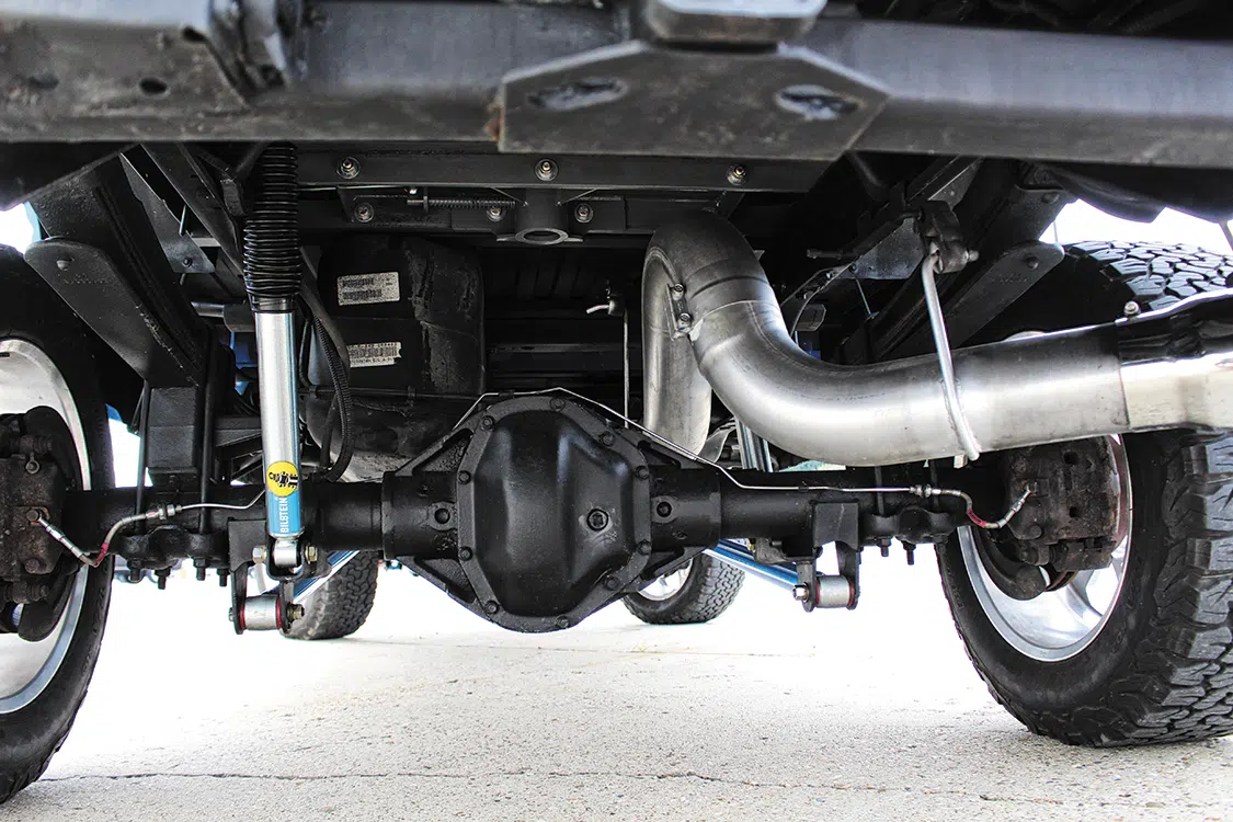 As for the rear axle, the stock Dana 80 remains untouched and still sports the 3.55:1 ring and pinion it left the factory with. Like the frame, leaf springs, lift blocks, U-bolts, and front axle, Michael treated the Dana 80 to rubberized under coating. Also notice the fresh brake lines, the new 5-inch Flo-Pro exhaust, and the 5100 series Bilstein shocks he had clear coated.