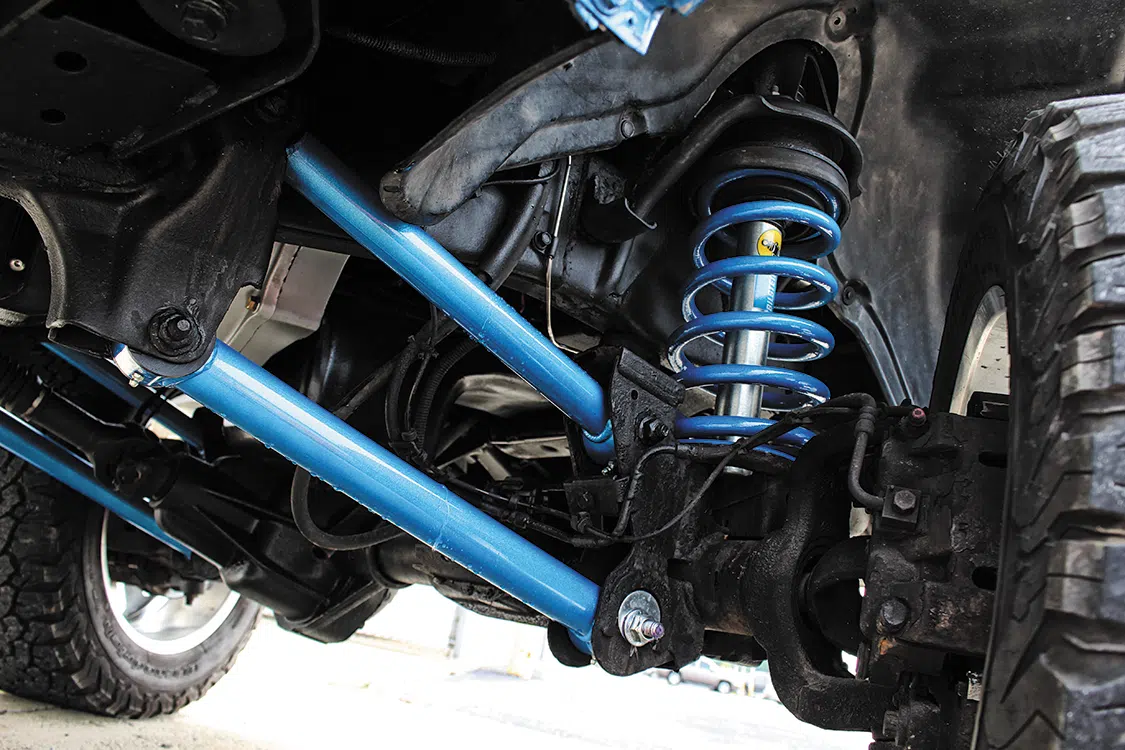 To level the truck off, a set of Rough Country 2.5-inch coil spring spacers were added up front. The coil springs themselves are stock, but were powder coated to match the rest of the truck, as were the 0-to-1-inch Stock Short tubular upper and lower control arms from Top Gun Customz.